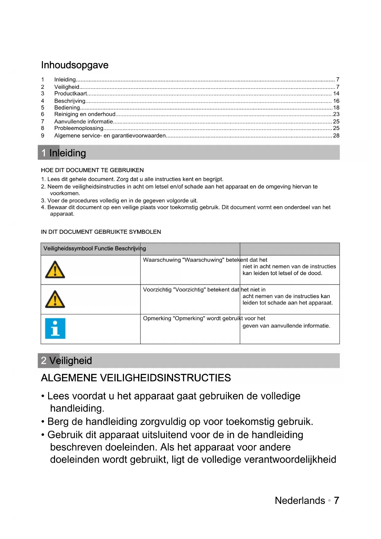 Veiligheidssymbool Functie Beschrijving Waarschuwing "Waarschuwing" betekent dat het niet in acht nemen van de instructies kan leiden tot letsel of de dood. Voorzichtig "Voorzichtig" betekent dat het niet in acht nemen van de instructies kan leiden tot schade aan het apparaat. Opmerking "Opmerking" wordt gebruikt voor het geven van aanvullende informatie. 2 Veiligheid ALGEMENE VEILIGHEIDSINSTRUCTIES