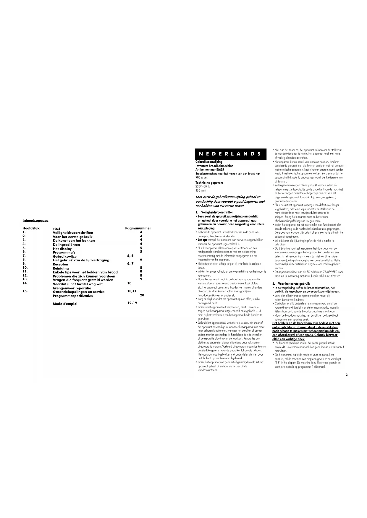 12-19 Titel Veiligheidsvoorschriften Voor het eerste gebruik De kunst van het bakken De ingrediënten Het display Programma’s Gebruikswijze Het gebruik van de tijdvertraging Recepten Reiniging Enkele tips voor het bakken van brood Problemen die zich kunnen voordoen Vragen die frequent gesteld worden Voordat u het toestel weg wilt brengenvoor reparatie Garantiebepalingen en service Programmaspecificaties Mode d'emploi N E D E R L A N D S4