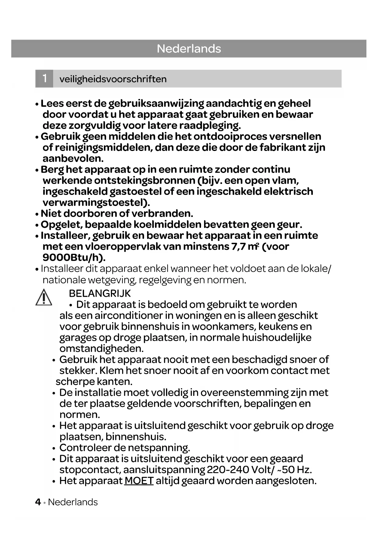 - Dompel het apparaat, het snoer of de stekker nooit onder in water. 6 • Nederlands• Dit apparaat is uitsluitend geschikt voor huishoudelijk gebruik. Wanneer het apparaat oneigenlijk gebruikt wordt, kan er bij eventuele defecten geen aanspraak op schadevergoeding worden gemaakt en vervalt het recht op garantie. Als u besluit het apparaat, vanwege een defect, niet langer te gebruiken, adviseren wij u, nadat u de stekker uit het stopcontact heeft verwijderd, het snoer af te knippen. Huishoudelijke apparaten horen niet in de vuilnisbak. Breng ze naar de betreffende afvalverwerkingsafdeling van uw gemeente. WAARSCHUWING Specifieke informatie voor apparaten met R290 koelgas.
