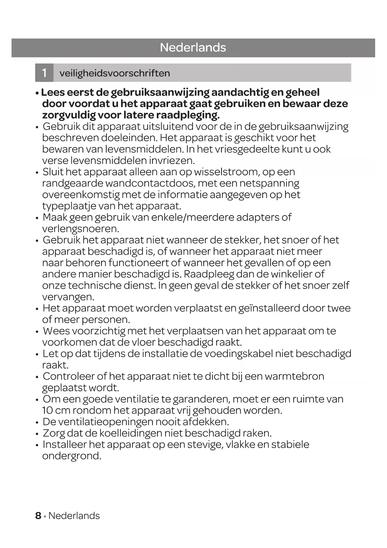 - Gebruik dit apparaat uitsluitend voor de in de gebruiksaanwijzing beschreven doeleinden. Het apparaat is geschikt voor het bewaren van levensmiddelen. In het vriesgedeelte kunt u ook verse levensmiddelen invriezen.