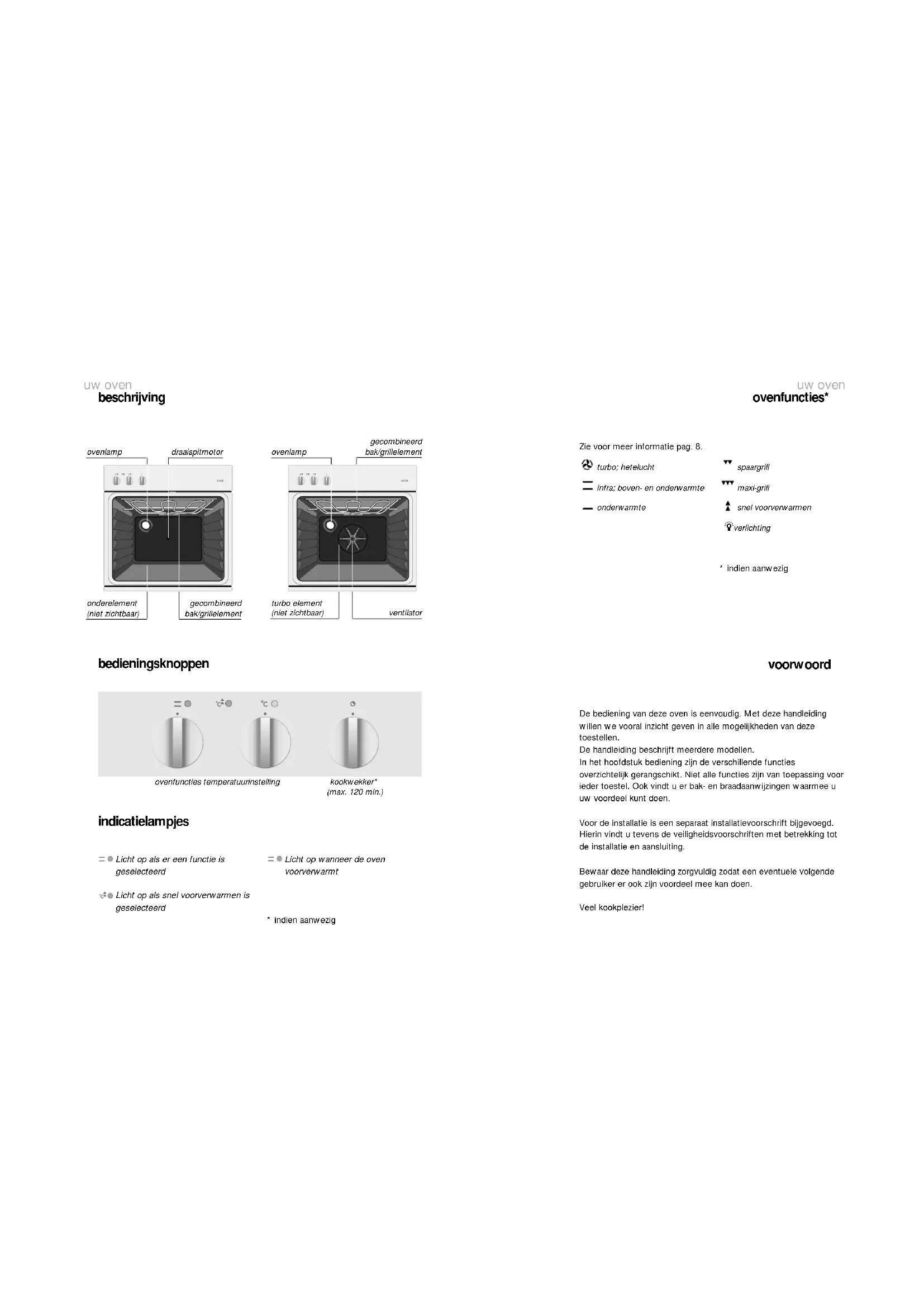 - indien aanwezig indicatielampjes Licht op als er een functie is geselecteerd Licht op als snel voorverwarmen is geselecteerd Licht op wanneer de oven voorverwarmt