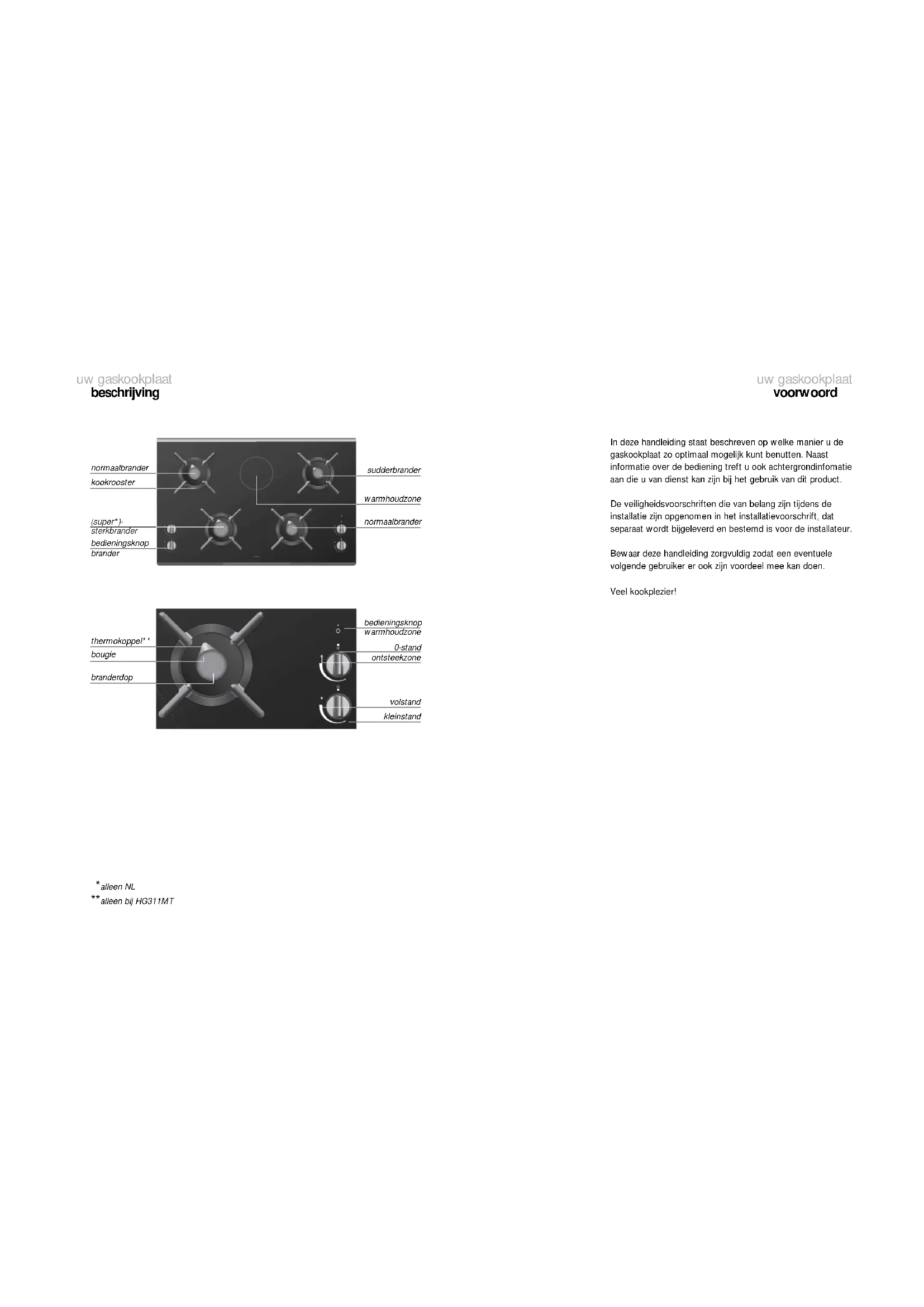 ongeveer 10 seconden ingedrukt (HG311MT). De brander ontsteekt. De brander blijft vonken zolang u de bedieningsknop ingedrukt houdt, ook als de brander al aan is (HG311MT). Ontsteekt de brander niet, controleer dan of: – de dop goed op de brander ligt; – de brander droog en schoon is. instellen Tussen vol-open en de kleinstand is de brander traploos regelbaar. let op! U kunt de brander alleen ontsteken in de ontsteekzone. NL 6 bediening warmhoudvlak inschakelen Druk gedurende één seconde op de tiptoets (zie illustratie). Het rode indicatielampje licht op. Het warmhoudvlak schakelt in. uitschakelen Druk op de tiptoets en het rode indicatielampje dooft. Het warmhoudvlak schakelt uit. comfortabel koken branders (super)sterkbrander Bakken en braden, frituren en blancheren, doorkoken van grote hoeveelheden en roerbakken gaat het beste op de (super)sterkbrander. Deze heeft het hoogste vermogen. Let wel op de diameter van de pan. Het beste is een diameter tussen 16 en 28 cm, alhoewel een pan van 12 cm ook op deze brander past. normaalbrander De normaalbrander is bij uitstek geschikt voor stoven en stomen, koken van gemiddelde porties (ongeveer vier personen) en het maken van een roux. Let wel op de diameter van de pan. Het beste is een diameter tussen 16 en 28 cm, alhoewel een pan van 12 cm ook op deze brander past. sudderbrander Sauzen bereiden, sudderen en doorkoken kunt u het beste doen op de sudderbrander. Op de vol-openstand is deze brander groot genoeg voor het doorkoken. ontsteekzone branderaanduiding Na twee uur schakelt de warmhoudzone vanzelf uit en gaat het indicatielampje knipperen. bediening warmhoudzone volstand kleinstand 0-stand indicatielampje tiptoetsNL 9 onderhoud reinigen NL 8 comfortabel koken pannen diameter Gebruik pannen met een maximale grootte van 28 cm voor de sudder-, sterk- en normaalbrander. Gebruik geen pannen met een kleinere bodemdiameter dan 12 cm. Kleinere pan- nen staan niet stabiel, grotere pannen kunnen oververhitting van wanden tot gevolg hebben. De punten van de vlam zijn het heetst. Als vlammen om de pan heen spelen gaat er veel warmte verloren. Om het gas zo efficiënt mogelijk te benutten kunt u het beste een pan met een grote diameter gebruiken. deksel Kook met het deksel op de pan. U bespaart dan tot 50% energie. warmhoudvlak Hoewel het warmhoudvlak een diameter van 13 cm heeft kunt u hierop alle pannen plaatsen. De warmtegeleiding van pannen is over het algemeen zo goed dat voor het warm houden van gerechten de diameter van de pan minder belangrijk is. branderdoppen/ringen De branderdoppen en branderringen zijn speciaal uitgevoerd om de vlam weg te houden van de roosterpunten. Voor een goede positionering zijn de branderdoppen en ringen voorzien van nokjes. Door beide voorzieningen wordt het afbranden en beschadigen van de roosterpunten beperkt. fout goed Gebruik het juiste formaat pannen. dagelijks Regelmatig onderhoud direct na gebruik voorkomt dat over- gekookt voedsel lange tijd kan inwerken en hardnekkige, moeilijk te verwijderen vlekken veroorzaakt. Reinig eerst de bedieningsknoppen, branders en kookroosters en dan pas de glasplaat. Hiermee voorkomt u dat de plaat tijdens het reinigen opnieuw vuil wordt. Voor de dagelijkse reiniging van uw gaskookplaat kunt u het beste een mild reinigingsmiddel gebruiken. Gebruik niet te veel vocht, aangezien dit de brander of ventilatieopeningen kan binnendringen. hardnekkige vlekken Hardnekkige vlekken kunt u het beste verwijderen met een vloeibaar reinigingsmiddel. Gebruik nooit schuurpoeders, agressieve reinigingsmiddelen of schuursponsjes. Maak de glasplaat schoon met een speciaal reinigingsmiddel voor ceramische kookplaten. Waterkringen of kalkresten verdwijnen het makkelijkst met behulp van schoonmaakazijn. let op! Overgekookte voedselresten direct verwijderen, met name van rode kool, appelmoes en rabarber. Wanneer deze voedselresten lang inwerken kan dit tot verkleuring leiden. Hete branderdoppen nooit onderdompelen in koud water. Door de sterke afkoeling kan het email beschadigd raken.