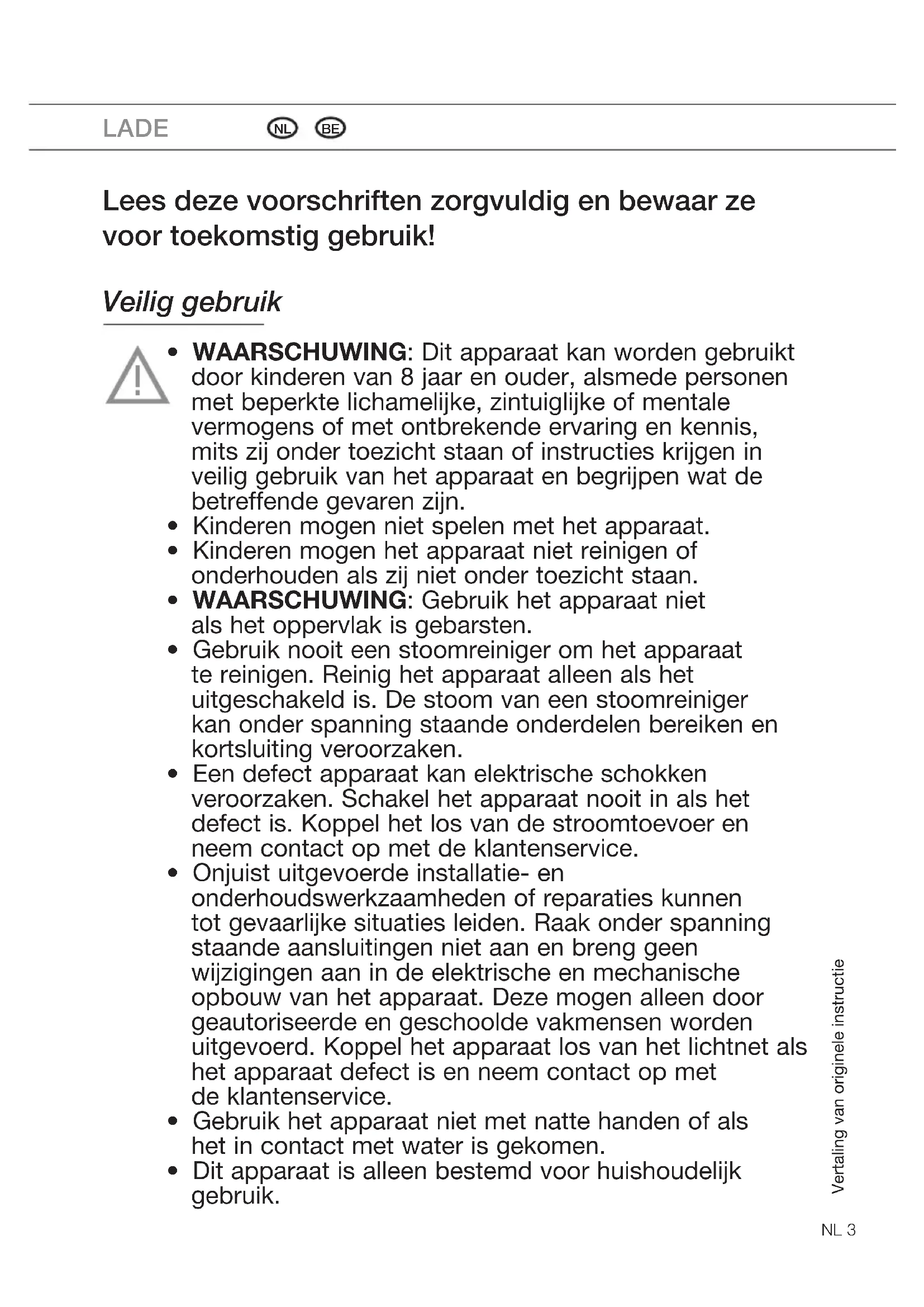 - Zorg ervoor dat het apparaat niet gekiept of op de korte kant wordt gemonteerd. In het apparaat bevind zich een pomp met een olie reservoir. Raadpleeg hiervoor het installatievoorschrift! LADENL 8 Als de veiligheidsinstructies en waarschuwingen niet worden opgevolgd, kan de fabrikant niet verantwoordelijk worden gehouden voor eventuele schade als gevolg hiervan. Als u besluit het apparaat niet langer te gebruiken vanwege een fout, raden we u aan het netsnoer af te knippen nadat u de stekker uit het stopcontact hebt gehaald. Breng het apparaat naar de gemeentelijke dienst voor afvalbeheer. LADEEN 3 DRAWER Read carefully and keep for future reference! Safe use