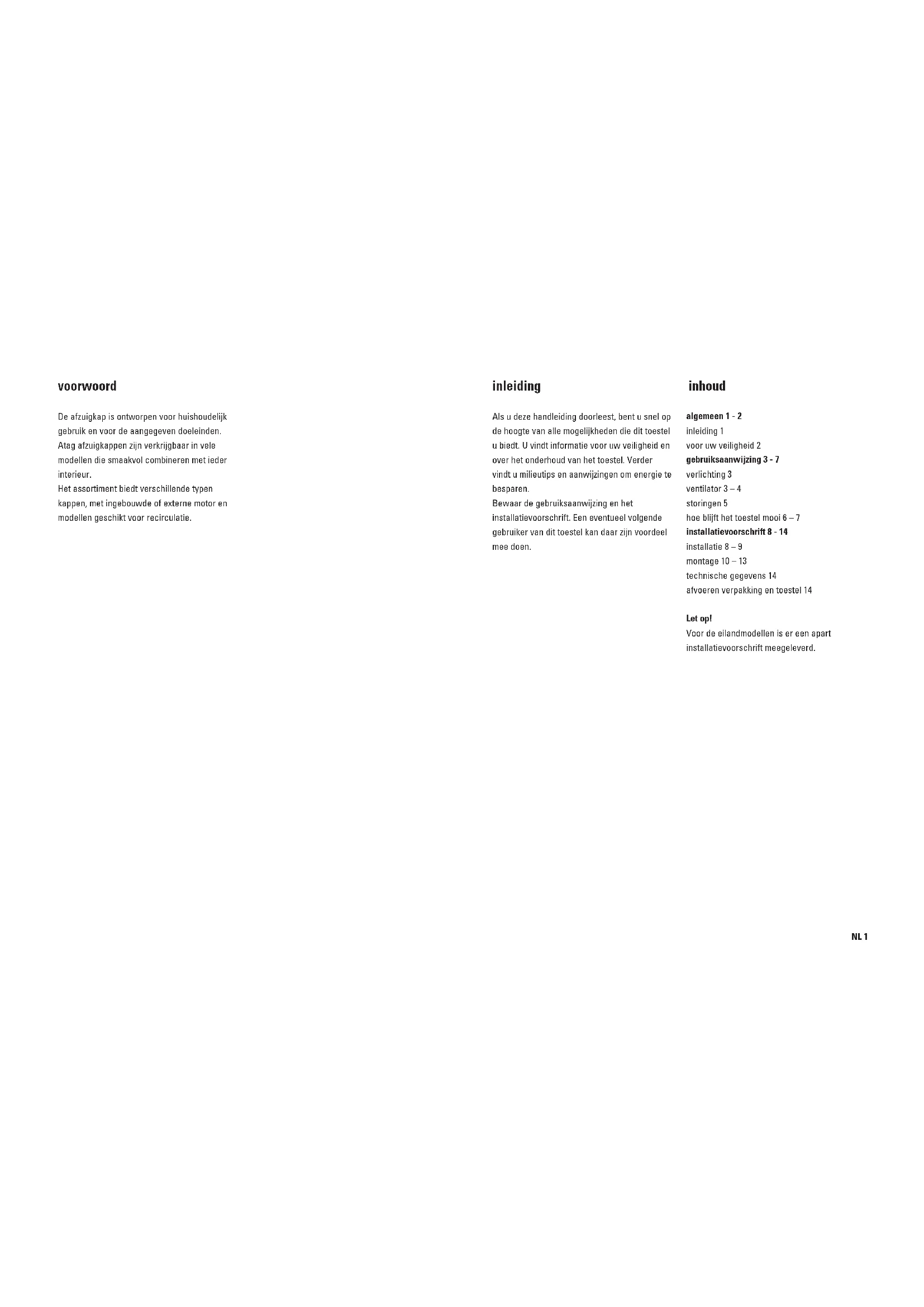 nederlands blz. NL 1 - NL 14 english page GB 1 - GB 14 français page FR 1 - FR 14 Deutsch Seite DE 1 - DE 14NL 1 inleiding Als u deze handleiding doorleest, bent u snel op de hoogte van alle mogelijkheden die dit toestel u biedt. U vindt informatie voor uw veiligheid en over het onderhoud van het toestel. Verder vindt u milieutips en aanwijzingen om energie te besparen. Bewaar de gebruiksaanwijzing en het installatievoorschrift. Een eventueel volgende gebruiker van dit toestel kan daar zijn voordeel mee doen. algemeen 1 - 2 inleiding 1 voor uw veiligheid 2 gebruiksaanwijzing 3 - 7 verlichting 3 ventilator 3 – 4 storingen 5 hoe blijft het toestel mooi 6 – 7 installatievoorschrift 8 - 14 installatie 8 – 9 montage 10 – 13 technische gegevens 14 afvoeren verpakking en toestel 14 Let op! Voor de eilandmodellen is er een apart installatievoorschrift meegeleverd. voorwoord De afzuigkap is ontworpen voor huishoudelijk gebruik en voor de aangegeven doeleinden. Atag afzuigkappen zijn verkrijgbaar in vele modellen die smaakvol combineren met ieder interieur. Het assortiment biedt verschillende typen kappen, met ingebouwde of externe motor en modellen geschikt voor recirculatie. inhoudNL 3 verlichting verlichting in- en uitschakelen Druk op de toets voor de verlichting . De verlichting gaat branden op de hoogste stand. Druk nogmaals op de toets en de verlichting geeft gedimd licht. Druk voor de derde keer en de verlichting gaat uit. Het indicatielampje in de toets dooft. ventilator inschakelen Druk op toets , of . De afzuigkap schakelt in op de ingetoetste stand. Het cijfer in de toets licht op. afzuigcapaciteit regelen Druk op een toets met een hogere of lagere waarde. Het cijfer in de toets licht op. intensiefstand Druk op toets . Het cijfer in de toets licht op.