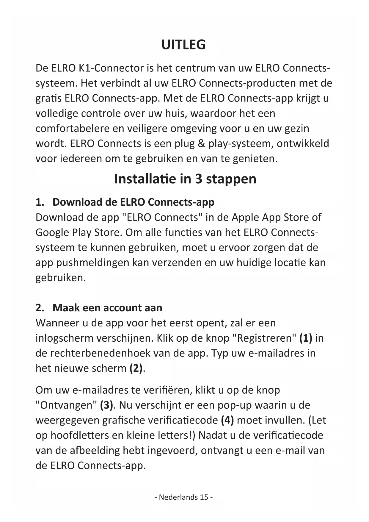 Wanneer u de app voor het eerst opent, zal er een inlogscherm verschijnen. Klik op de knop "Registreren" (1) in de rechterbenedenhoek van de app. Typ uw e-mailadres in het nieuwe scherm (2). Om uw e-mailadres te verifiëren, klikt u op de knop "Ontvangen" (3). Nu verschijnt er een pop-up waarin u de weergegeven grafische verificaecode (4) moet invullen. (Let op hoofdleers en kleine leers!) Nadat u de verificaecode van de aeelding hebt ingevoerd, ontvangt u een e-mail van de ELRO Connects-app.- Nederlands 16 - Als u de e-mail op uw telefoon bekijkt, moet u de ELRO Connects-app opnieuw openen, uw e-mailadres invullen en de verificaecode die u in uw e-mail hebt ontvangen moet worden ingevuld in de app links van de knop "Ophalen" (3).