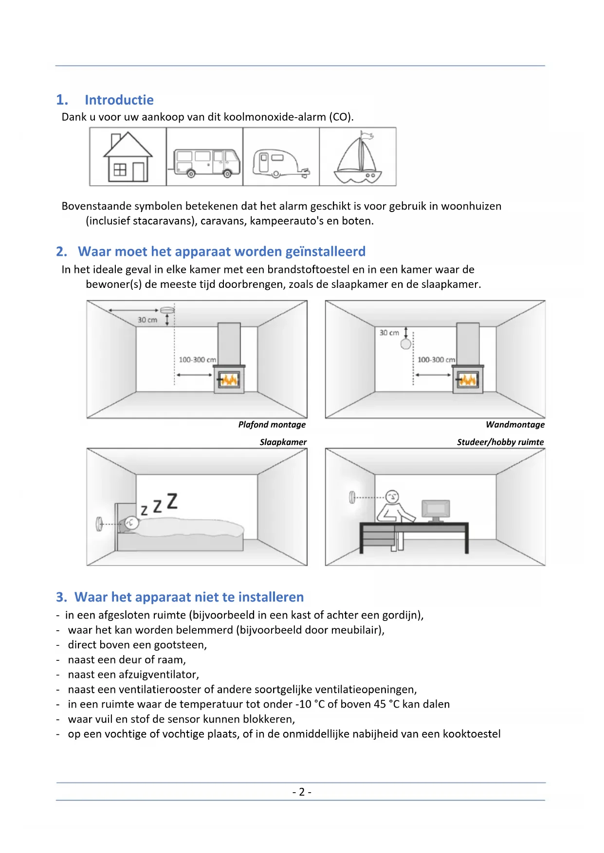 Deze handleiding bevat belangrijke veiligheidsinformatie over de installatie en bediening van het alarm. Lees de handleiding zorgvuldig door en bewaar hem op een veilige plaats voor toekomstige raadpleging. - Dit apparaat moet worden geïnstalleerd door een gekwalificeerd persoon - De installatie van een koolmonoxidedetector mag niet in de plaats komen van een juiste installatie, gebruik en onderhoud van verbrandingstoestellen en geschikte ventilatie- en afzuigsystemen. - Dit product is niet waterbestendig en is alleen geschikt voor gebruik binnenshuis. Reinig het product alleen met een droge doek. - Probeer het apparaat niet te repareren, het heeft het risico van elektrische schokken of storingen als er aan het apparaat wordt geknoeid. - Stel het product en de batterijen niet bloot aan extreme temperaturen. - De volgende stoffen kunnen de sensor beïnvloeden en valse alarmen veroorzaken: methaan, propaan, isobutyleen, isopropanol, ethyleen, benzeen, tolueen, ethylacetaat, waterstofsulfide, zwaveldioxide, producten op alcoholbasis, verf, verdunners, oplosmiddelen, kleefstoffen, haarsprays, aftershaves, parfums en sommige schoonmaakmiddelen.- 6 -
