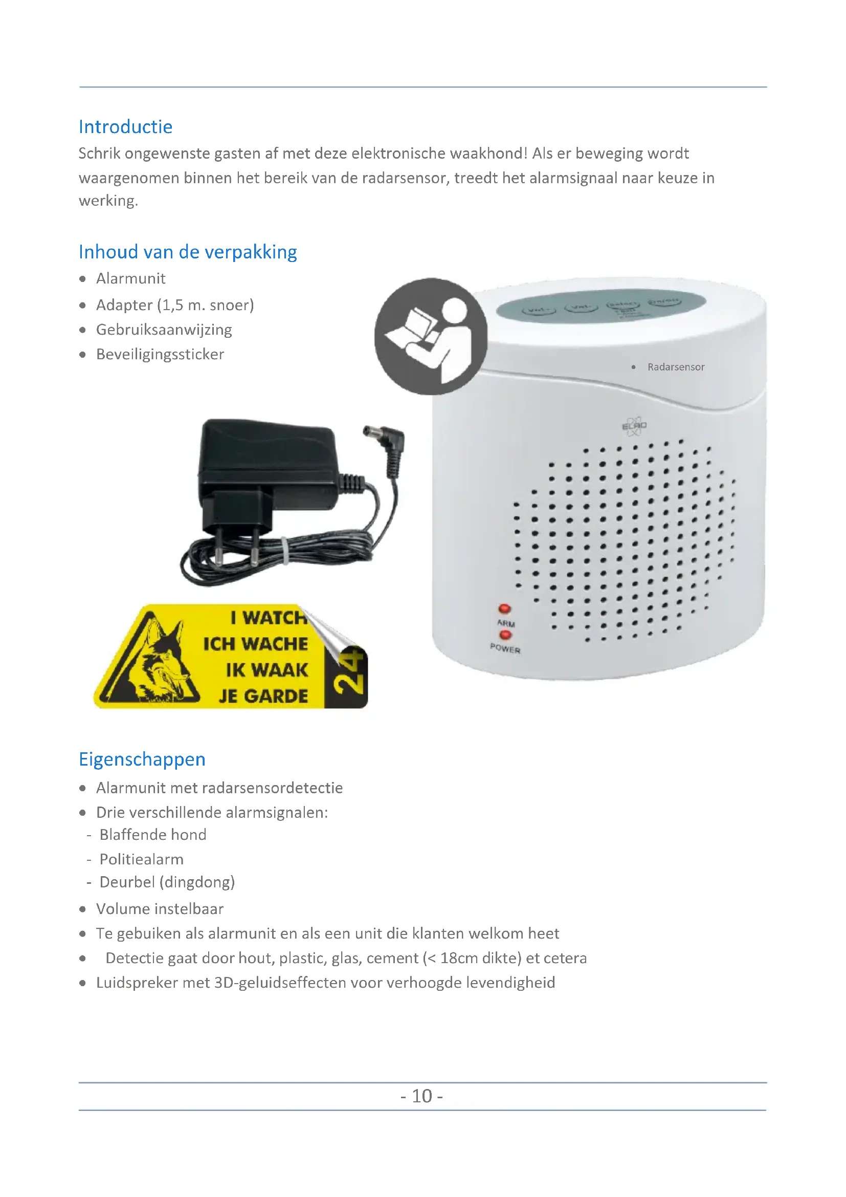 - Dit product is enkel geschikt voor gebruik binnenshuis. Plaats de alarmunit niet op een plaats waar hij wordt blootgesteld aan direct zonlicht, hoge temperaturen (zoals radiatoren of kachels) of regen. Open dit apparaat niet anders dan bedoeld is en probeer het apparaat niet zelf te repareren/wijzigen. De garantie op dit product vervalt als hij anders gebruikt wordt dan aangegeven door de leverancier.