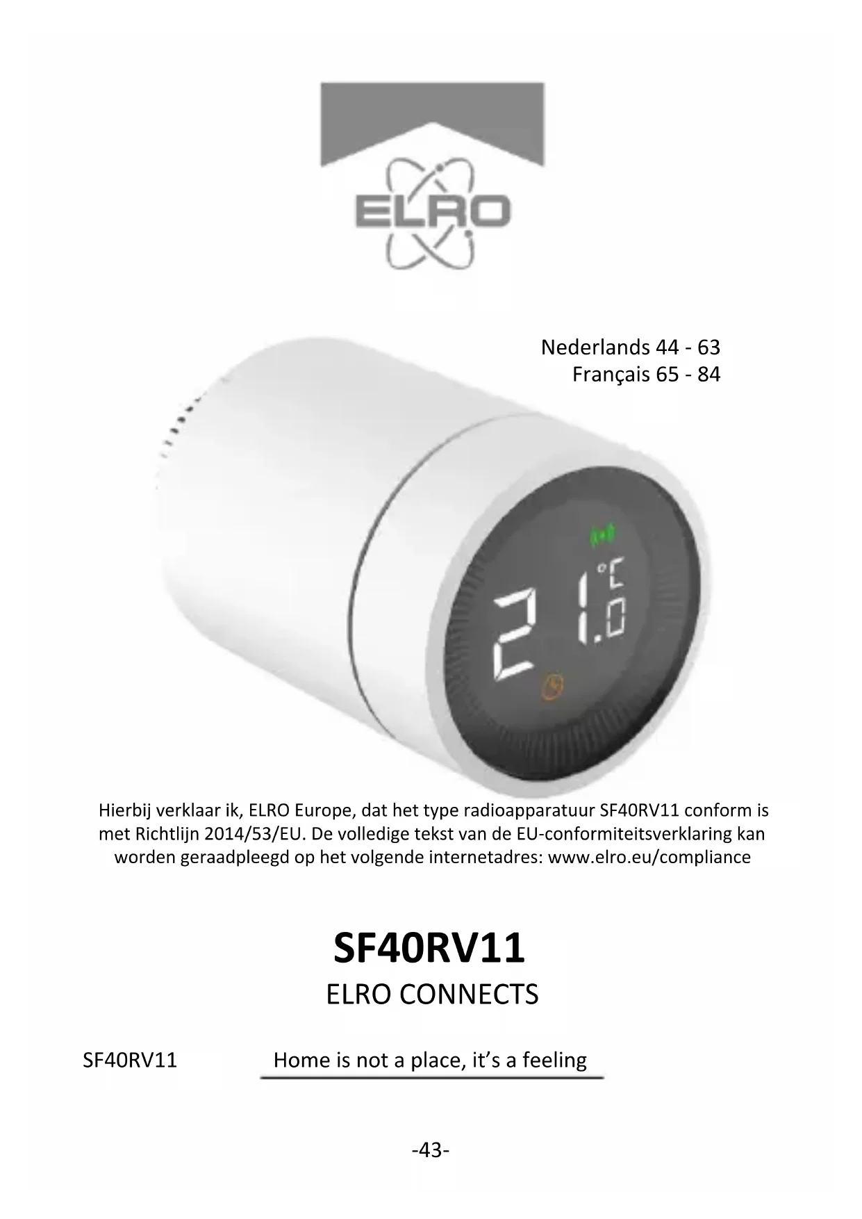 Hierbij verklaar ik, ELRO Europe, dat het type radioapparatuur SF40RV11 conform is met Richtlijn 2014/53/EU. De volledige tekst van de EU-conformiteitsverklaring kan worden geraadpleegd op het volgende internetadres: www.elro.eu/compliance SF40RV11 ELRO CONNECTS SF40RV11 Home is not a place, it’s a feeling-44- Overzicht Gefeliciteerd met de aanschaf van de SF40RV. Met deze slimme radiatorknop heb je volledige controle over de verwarming in jouw huis en dat zelfs op afstand. Het apparaat is gemakkelijk te verbinden met jouw ELRO Smart Home systeem. Uitleg over het product Kenmerken