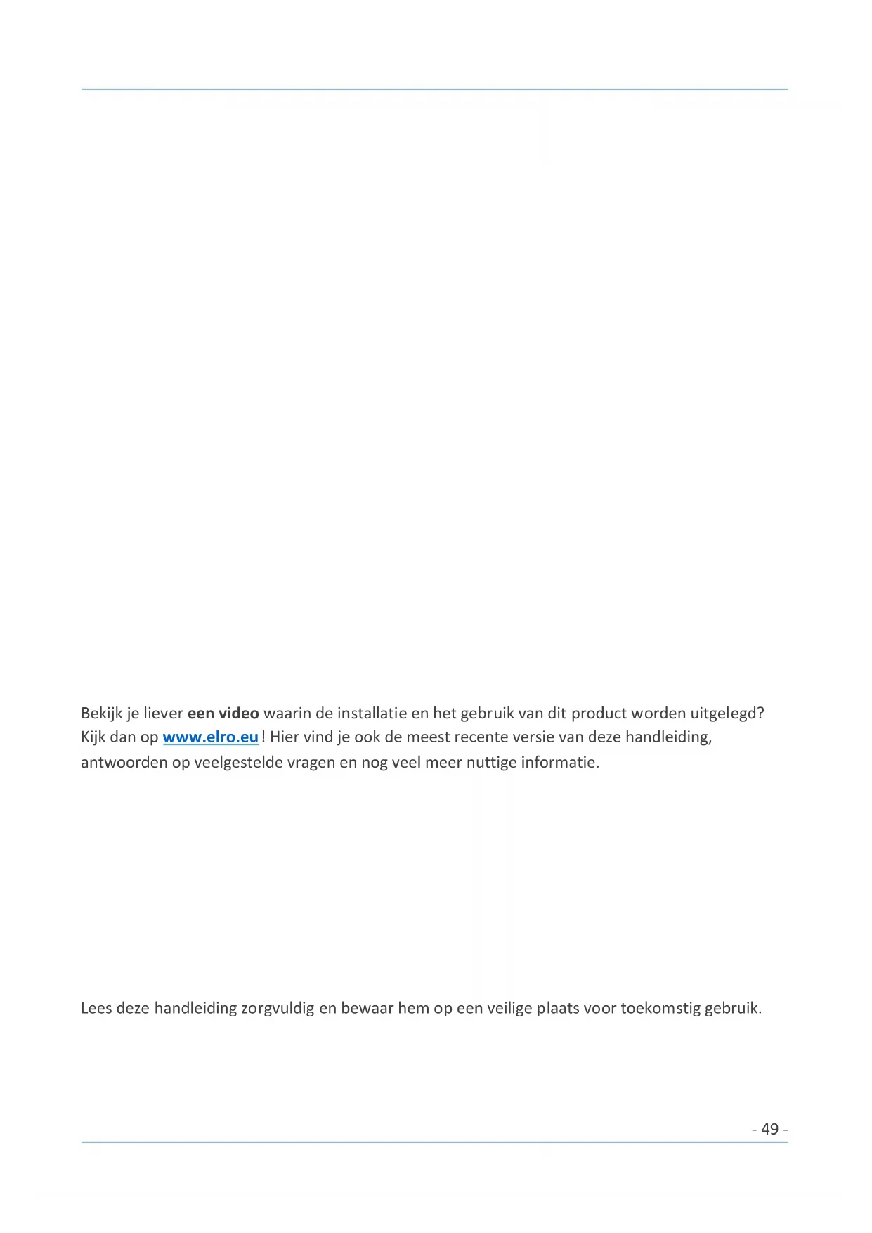 - Ga naar www.elro.eu om snel antwoord te krijgen op je vraag. Hier vind je onder andere antwoorden op veelgestelde vragen, gedetailleerde installatievideo’s en de meest recente versie van de handleiding van je product.