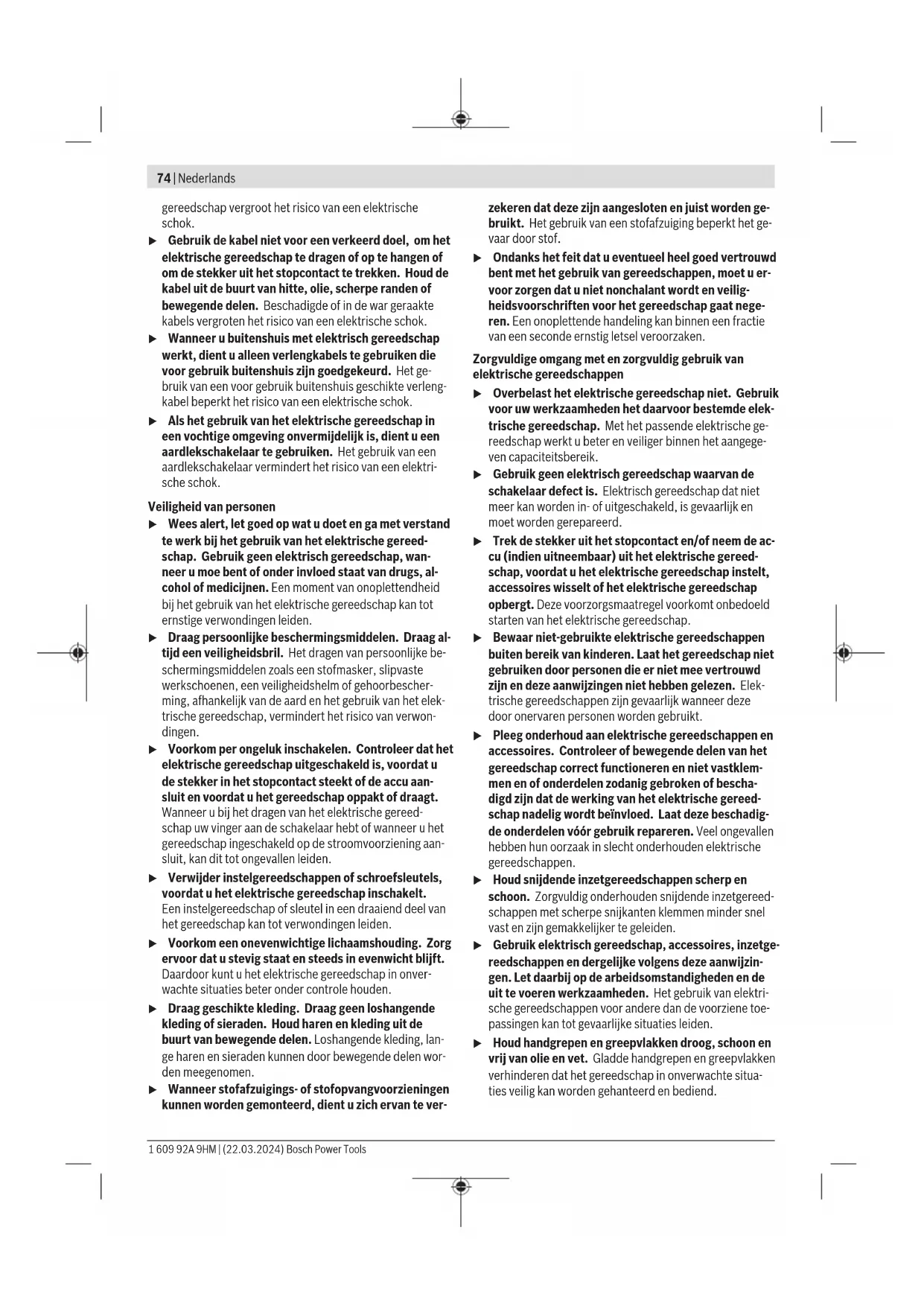 Interruttore con bloccaggio Per mettere in funzione l’elettroutensile, prima premere l’interruttore di avvio/arresto(2) ➊, poi spingerlo in avanti ➋. Quindi premerlo e tenerlo premuto ➌. Per bloccare l’interruttore di avvio/arresto(2) in posizione premuta, spingere l’interruttore di avvio/arresto(2) ulterior- mente in avanti ➍. Per spegnere l’elettroutensile, rilasciare l’interruttore di av- vio/arresto(2) oppure, se l’interruttore è bloccato, premere brevemente l’interruttore di avvio/arresto(2), dopodiché ri- lasciarlo. Interruttore senza bloccaggio Per mettere in funzione l’elettroutensile, prima premere l’interruttore di avvio/arresto(2) ➊, poi spingerlo in avanti ➋. Quindi premerlo e tenerlo premuto ➌. Per spegnere l’elettroutensile, rilasciare l’interruttore di av- vio/arresto(2). u Controllare gli accessori di levigatura prima dell’uso. L’accessorio di levigatura dovrà essere montato a re- gola d’arte e dovrà poter ruotare liberamente. Esegui- re un test di funzionamento per almeno 1 minuto, in assenza di carico. Non utilizzare accessori di levigatu- ra danneggiati, ovalizzati o vibranti. Accessori di levi- gatura danneggiati possono frantumarsi ed essere causa di lesioni. 1 609 92A 9HM | (22.03.2024) Bosch Power ToolsNederlands | 73 Manutenzione ed assistenza Manutenzione e pulizia u Prima di qualunque intervento sull’elettroutensile estrarre la spina di rete dalla presa. u Per poter garantire buone e sicure operazioni di lavo- ro, tenere sempre pulite l’elettroutensile e le fessure di ventilazione. u In condizioni d’impiego estreme, laddove possibile, utilizzare sempre un impianto di aspirazione. Stasare con frequenza le feritoie d’aerazione ed installare a monte un interruttore differenziale (PRCD). Qualora si lavorino metalli, è possibile che si depositi polvere con- duttiva all’interno dell’elettroutensile. Ciò potrebbe pre- giudicare l’isolamento protettivo dell’elettroutensile stes- so. Conservare e trattare con cura l’accessorio. Se fosse necessaria una sostituzione della linea di collega- mento, questa dovrà essere eseguita da Bosch oppure da un centro assistenza clienti autorizzato per elettroutensili Bosch, al fine di evitare pericoli per la sicurezza. Servizio di assistenza e consulenza tecnica Il servizio di assistenza risponde alle Vostre domande relati- ve alla riparazione e alla manutenzione del Vostro prodotto nonché concernenti i pezzi di ricambio. Disegni in vista esplosa e informazioni relative ai pezzi di ricambio sono con- sultabili anche sul sito www.bosch-pt.com Il team di consulenza tecnica Bosch sarà lieto di rispondere alle Vostre domande in merito ai nostri prodotti e accessori. In caso di richieste o di ordinazione di pezzi di ricambio, co- municare sempre il codice prodotto a 10cifre riportato sulla targhetta di fabbricazione dell’elettroutensile. Italia Tel.: (02) 3696 2314 E-Mail: pt.hotlinebosch@it.bosch.com Per ulteriori indirizzi del servizio assistenza consultare: www.bosch-pt.com/serviceaddresses Smaltimento Avviare ad un riciclaggio rispettoso dell’ambiente gli imbal- laggi, gli elettroutensili e gli accessori dismessi. Non gettare elettroutensili dismessi tra i rifiuti domestici! Solo per i Paesi dellaCE: Conformemente alla Direttiva Europea 2012/19/UE sui rifiu- ti di apparecchiature elettriche ed elettroniche (RAEE) ed all’attuazione del recepimento nel diritto nazionale, gli elet- troutensili diventati inservibili devono essere raccolti sepa- ratamente ed essere smaltiti/riciclati nel rispetto dell’am- biente. In caso di smaltimento improprio, le apparecchiature elettri- che ed elettroniche potrebbero avere effetti nocivi sull'am- biente e sulla salute umana a causa della possibile presenza di sostanze nocive. Nederlands Veiligheidsaanwijzingen Algemene veiligheidsaanwijzingen voor elektrische gereedschappen WAARSCHU- WING Lees alle waarschuwingen, veilig- heidsaanwijzingen, afbeeldingen en specificaties die bij dit elektri- sche gereedschap worden geleverd. Als de hieronder ver- melde aanwijzingen niet worden opgevolgd, kan dit een elek- trische schok, brand en/of ernstig letsel tot gevolg hebben. Bewaar alle waarschuwingen en voorschriften voor toe- komstig gebruik. Het in de waarschuwingen gebruikte begrip elektrisch ge- reedschap heeft betrekking op elektrische gereedschappen voor gebruik op het stroomnet (met netsnoer) en op elektri- sche gereedschappen voor gebruik met een accu (zonder netsnoer). Veiligheid van de werkomgeving u Houd uw werkomgeving schoon en goed verlicht. Een rommelige of onverlichte werkomgeving kan tot ongeval- len leiden. u Werk met het elektrische gereedschap niet in een om- geving met explosiegevaar waarin zich brandbare vloeistoffen, brandbare gassen of brandbaar stof be- vinden. Elektrische gereedschappen veroorzaken vonken die het stof of de dampen tot ontsteking kunnen brengen. u Houd kinderen en andere personen tijdens het ge- bruik van het elektrische gereedschap uit de buurt. Wanneer u wordt afgeleid, kunt u de controle over het ge- reedschap verliezen. Elektrische veiligheid u De aansluitstekker van het elektrische gereedschap moet in het stopcontact passen. De stekker mag in geen geval worden veranderd. Gebruik geen adapter- stekkers in combinatie met geaarde elektrische ge- reedschappen. Onveranderde stekkers en passende stopcontacten beperken het risico van een elektrische schok. u Voorkom aanraking van het lichaam met geaarde op- pervlakken, bijvoorbeeld van buizen, verwarmingen, fornuizen en koelkasten. Er bestaat een verhoogd risico door een elektrische schok wanneer uw lichaam geaard is. u Houd het gereedschap uit de buurt van regen en vocht. Het binnendringen van water in het elektrische Bosch Power Tools 1 609 92A 9HM | (22.03.2024)74 | Nederlands gereedschap vergroot het risico van een elektrische schok. u Gebruik de kabel niet voor een verkeerd doel, om het elektrische gereedschap te dragen of op te hangen of om d