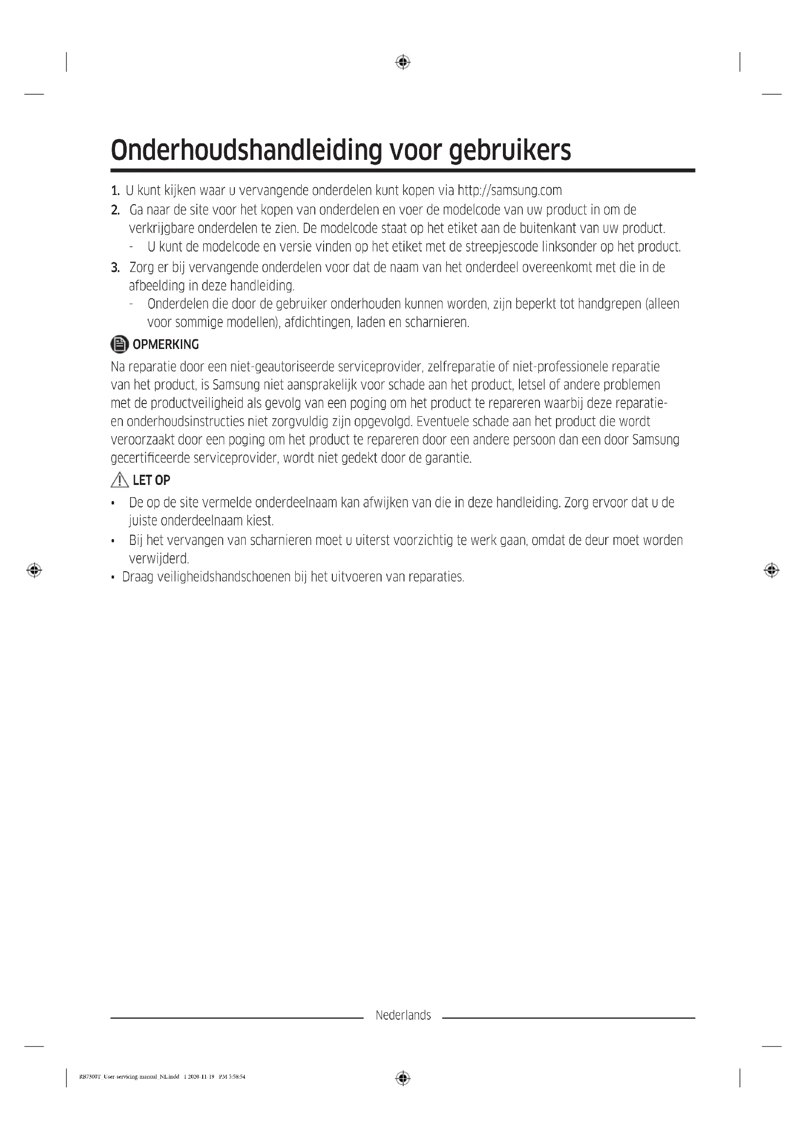 - Draag veiligheidshandschoenen bij het uitvoeren van reparaties. RB7300T_User-servicing-manual_NL.indd 1 2020-11-19 PM 5:58:54Nederlands Het werkelijke uiterlijk en de meegeleverde onderdelen van uw koelkast kunnen afwijken, afhankelijk van het model en het land.