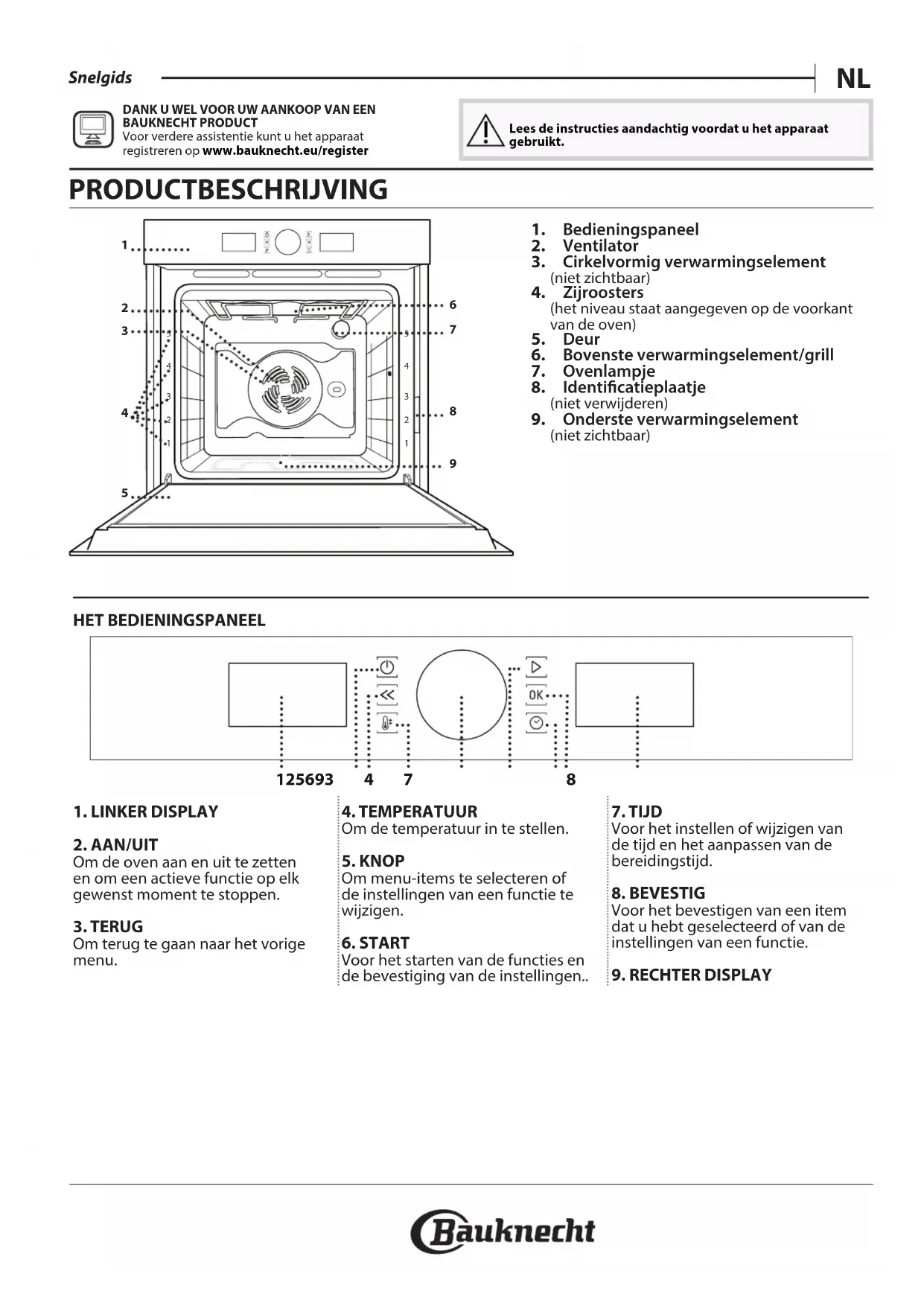 XNL Snelgids DANK U WEL VOOR UW AANKOOP VAN EEN BAUKNECHT PRODUCT Voor verdere assistentie kunt u het apparaat registreren op www.bauknecht.eu/register Lees de instructies aandachtig voordat u het apparaat gebruikt. PRODUCTBESCHRIJVING