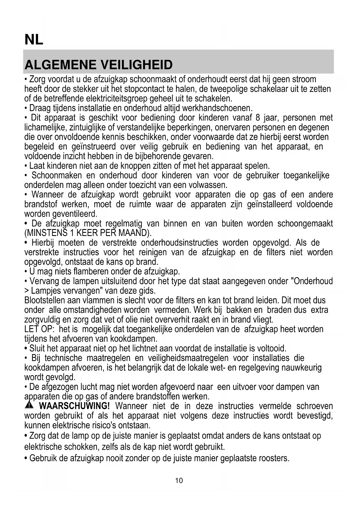 - Laat NOOIT andere zaken op de afzuigkap rusten, tenzij specifiek aangegeven.