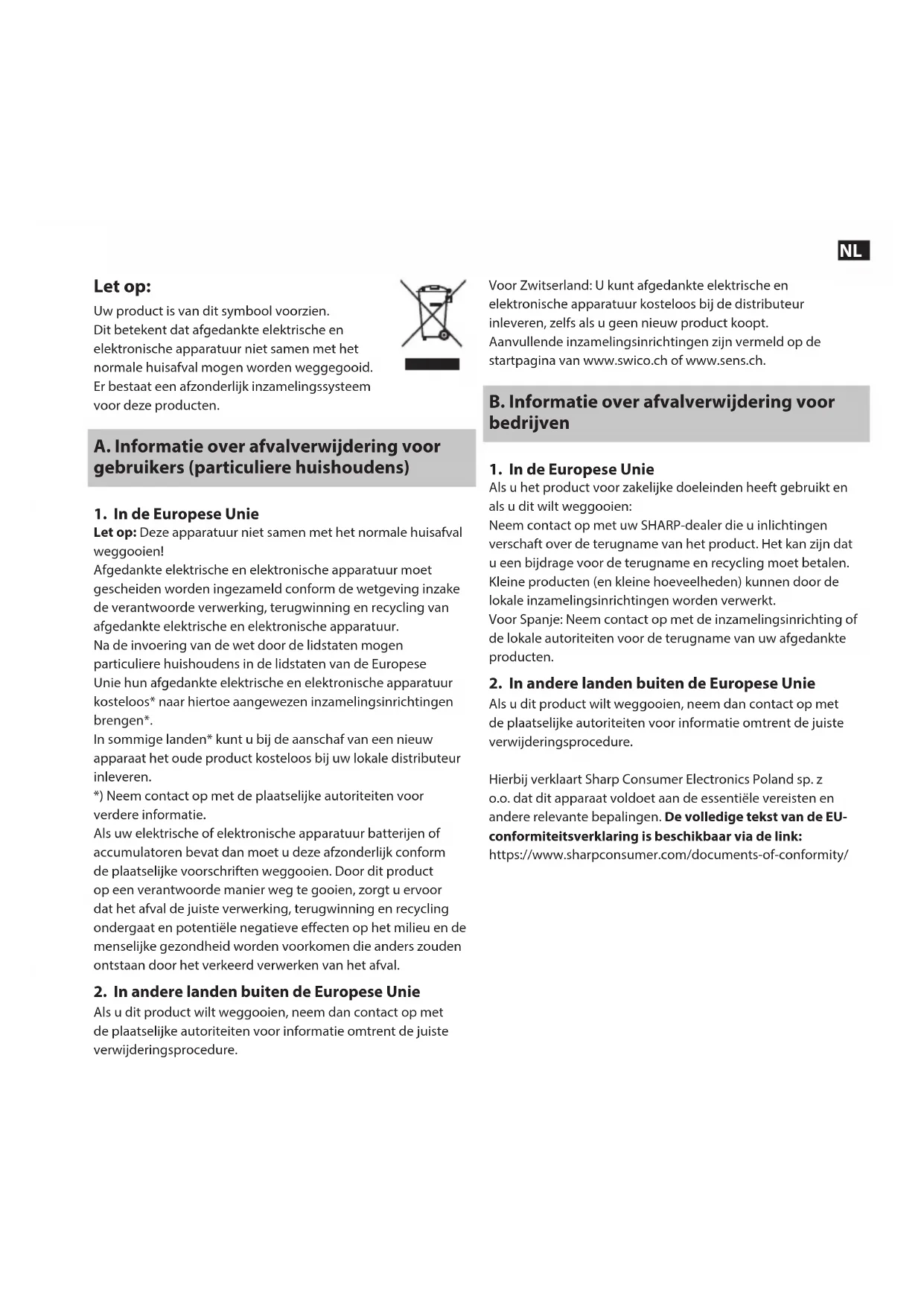 Geachte klant, Bedankt voor de aankoop van deze SHARP- apparatuur. Wij willen u erop wijzen dat uw garantierechten terug te vinden zijn op de Europese Garantiekaart. U kunt deze garantierechten downloaden van de website www.sharpconsumer.eu of vraag ernaar bij de verkoper waar u uw apparatuur hebt gekocht. U kunt ook een kopie van de garantierechten verkrijgen via e-mail of de reguliere post. Vraag dit aan door een verzoek te sturen naar service.nl@sharpconsumer.eu of door te bellen naar telefoonnummer +31-20-7508320. Bewaar uw aankoopbewijs, aangezien dit nodig is om van de garantierechten gebruik te kunnen maken.8