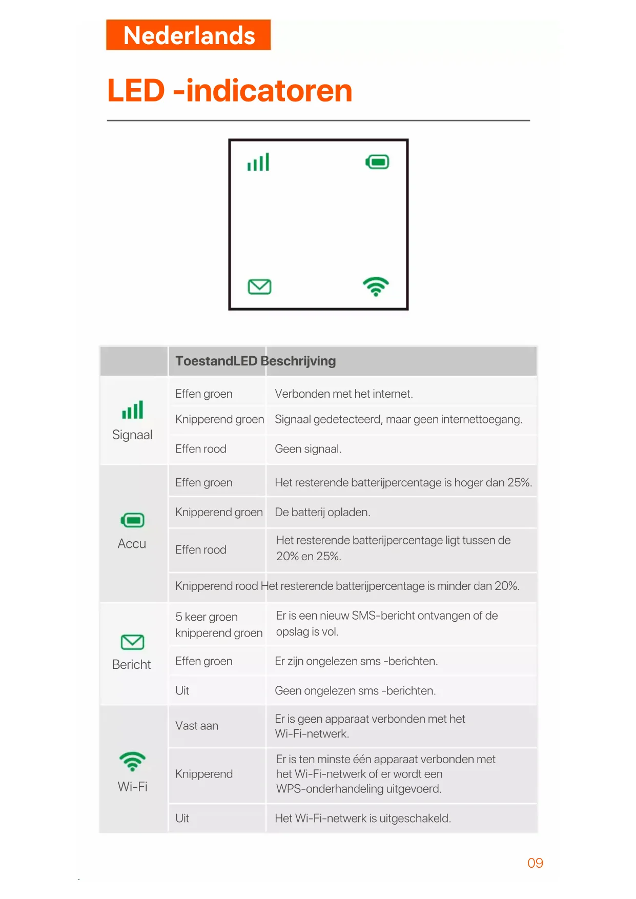 LED -indicatoren ToestandLED Beschrijving Effen groen Knipperend groen Effen rood Verbonden met het internet. Signaal gedetecteerd, maar geen internettoegang. Geen signaal. Effen groen Knipperend groen Effen rood Het resterende batterijpercentage is hoger dan 25%. De batterij opladen. 5 keer groen knipperend groen Effen groen Uit Er zijn ongelezen sms -berichten. Geen ongelezen sms -berichten. Vast aan Knipperend Uit Er is geen apparaat verbonden met het Wi-Fi-netwerk. Het Wi-Fi-netwerk is uitgeschakeld. Knipperend rood Het resterende batterijpercentage is minder dan 20%. Signaal Accu Bericht Wi-Fi Het resterende batterijpercentage ligt tussen de 20% en 25%. Er is een nieuw SMS-bericht ontvangen of de opslag is vol. Er is ten minste één apparaat verbonden met het Wi-Fi-netwerk of er wordt een WPS-onderhandeling uitgevoerd.Nederlands