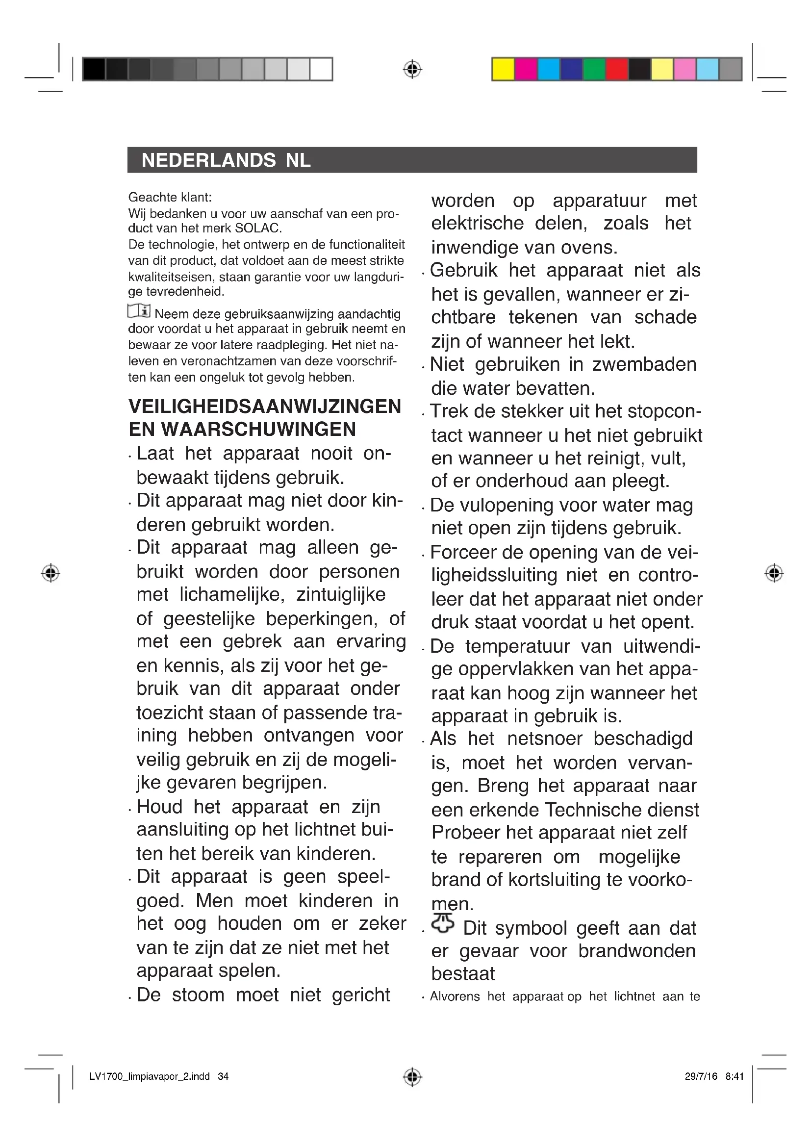 LV1700_limpiavapor_2.indd 32 29/7/16 8:41It Questo simbolo indica che l’utente deve leggere attentamente le istruzioni prima di pro- cedere. Questo apparecchio rispetta la Direttiva 2014/35/UE di Bassa Tensione, la Direttiva 2014/30/UE di Compatibilità Elettromagnetica, la Direttiva 2011/65/UE sui limiti d’impiego di de- terminate sostanze pericolose negli apparecchi elettrici ed elettronici e la Direttiva 2009/125/CE riguardante l’Ecodesign dei prodotti che consu- mano energia. LV1700_limpiavapor_2.indd 33 29/7/16 8:41nedeRLAndS nL Geachte klant: Wij bedanken u voor uw aanschaf van een pro- duct van het merk SOLAC. De technologie, het ontwerp en de functionaliteit van dit product, dat voldoet aan de meest strikte kwaliteitseisen, staan garantie voor uw langduri- ge tevredenheid. Neem deze gebruiksaanwijzing aandachtig door voordat u het apparaat in gebruik neemt en bewaar ze voor latere raadpleging. Het niet na- leven en veronachtzamen van deze voorschrif- ten kan een ongeluk tot gevolg hebben. VeILIgheIdSAAnwIjzIngen en wAARSchuwIngen