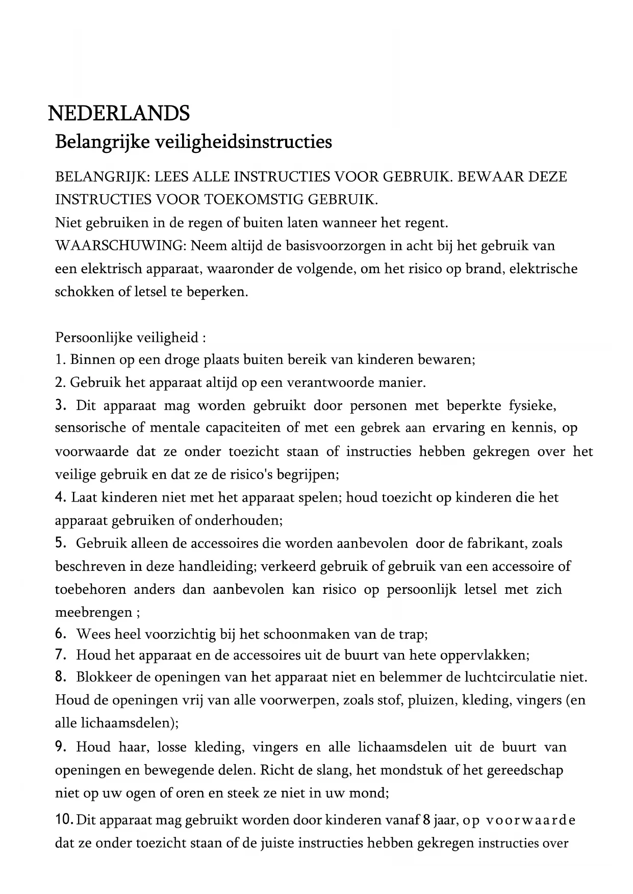 Adeva SAS / H.Koenig Europe - 8 rue Marc Seguin, 77290 Mitry-Mory, France www.hkoenig.com - https://kundenservice.hkoenig.com - Tél: +33 1 64 67 00 0NEDERLANDS Belangrijke veiligheidsinstructies BELANGRIJK: LEES ALLE INSTRUCTIES VOOR GEBRUIK. BEWAAR DEZE INSTRUCTIES VOOR TOEKOMSTIG GEBRUIK. Niet gebruiken in de regen of buiten laten wanneer het regent. WAARSCHUWING: Neem altijd de basisvoorzorgen in acht bij het gebruik van een elektrisch apparaat, waaronder de volgende, om het risico op brand, elektrische schokken of letsel te beperken. Persoonlijke veiligheid :