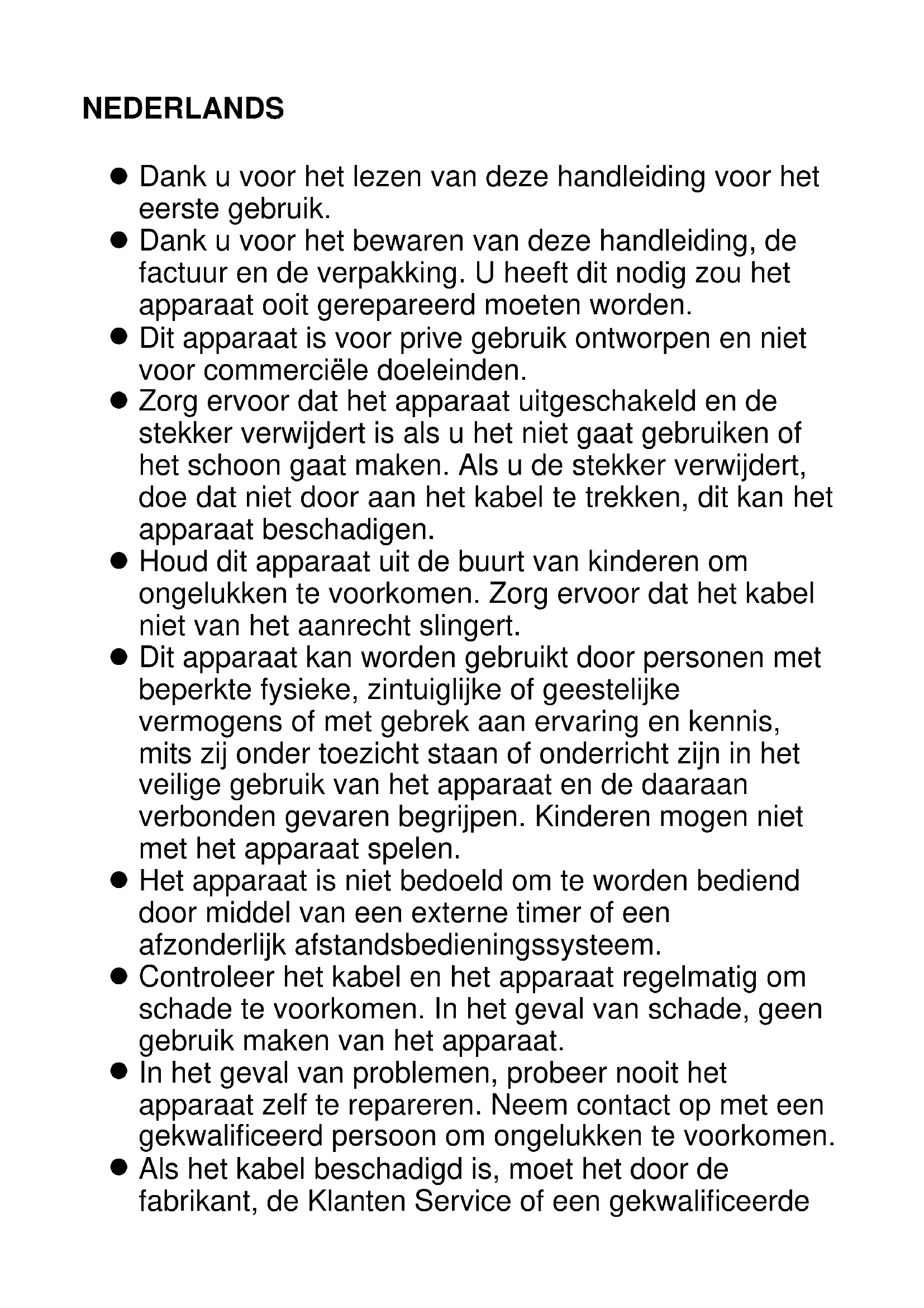 Laat het apparaat nooit onbeheerd achter als het in gebruik is. Schakel het apparaat altijd uit als u het niet gebruikt ook als is het voor een korte periode.