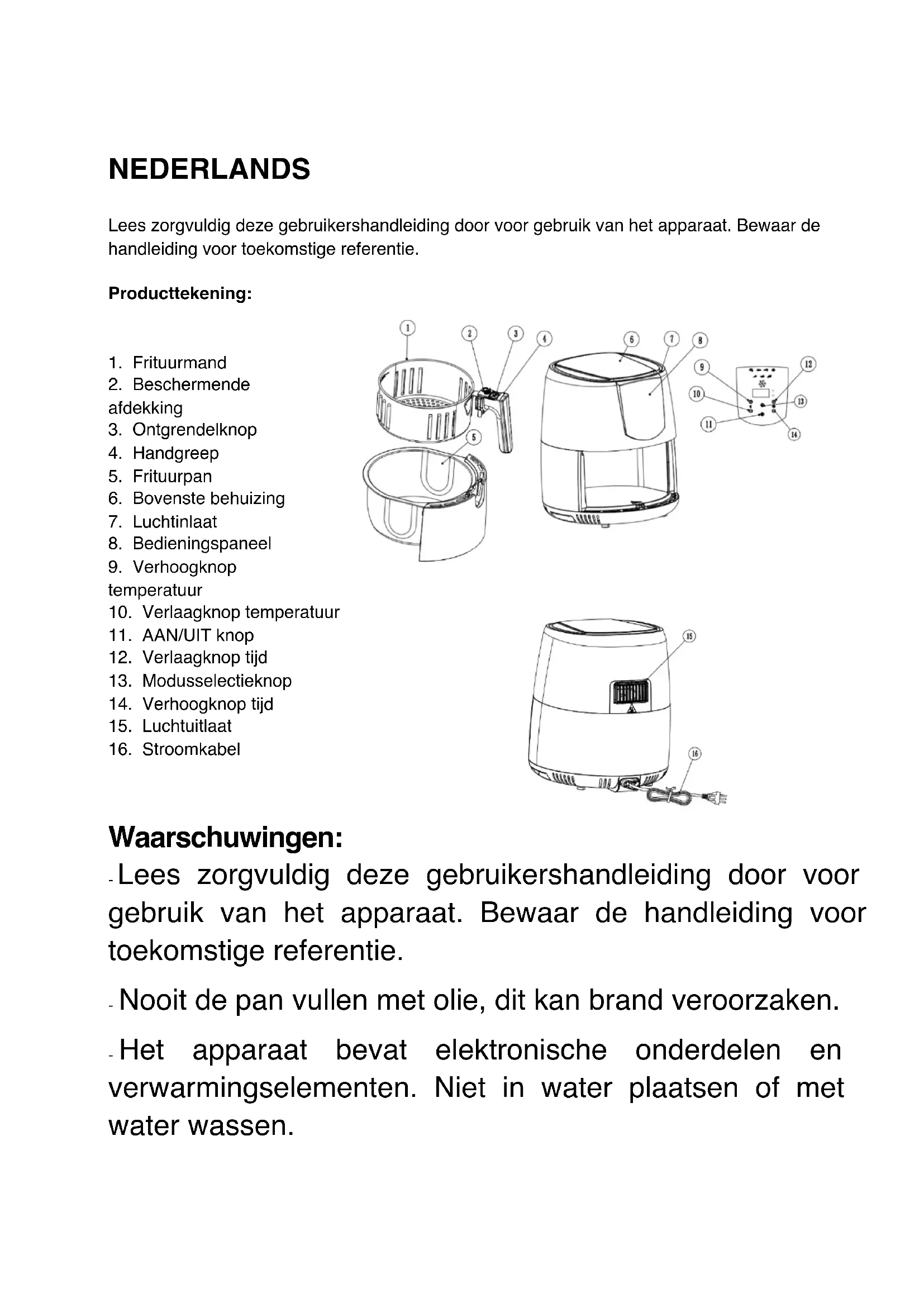 Waarschuwingen: - Lees zorgvuldig deze gebruikershandleiding door voor gebruik van het apparaat. Bewaar de handleiding voor toekomstige referentie. - Nooit de pan vullen met olie, dit kan brand veroorzaken. - Het apparaat bevat elektronische onderdelen en verwarmingselementen. Niet in water plaatsen of met water wassen.- Niet de luchtinlaat of -uitlaat afdekken als het apparaat in gebruik is. Raak de binnenkant van het apparaat niet aan om verbrandingen te vermijden. - De oppervlaktes kunnen heet worden tijdens gebruik. Raak de hete oppervlakken niet aan. Gebruik de handgreep en knop. - Er zal hete lucht uit de luchtuitlaat komen als het apparaat in gebruik is. Blijf op veilige afstand. Raak de hete oppervlakken niet aan. Dek de luchtuitlaat niet af. Bij het openen van de deksel dient u rekening te houden met hete lucht. Veiligheidswaarschuwing: - Houd de stekker schoon om ongelukken te voorkomen. - Niet de kabel beschadigen, eraan trekken, verdraaien, zware dingen op zetten, vervormen, laten hangen over de rand van een tafel of aanrecht, of hete oppervlaktes aanraken, om zo een elektrische schok, vuur of andere ongelukken te voorkomen. Als de stroomkabel beschadigd is, moet die worden vervangen door de fabrikant, een servicemonteur of een gekwalificeerd persoon om gevaren te vermijden. - Niet de stekker plaatsen of verwijderen met natte handen, anders kan dit tot een elektrische schok leiden.- Steek de stekker stevig in het stopcontact, anders kan dit leiden tot een elektrische schok, kortsluiting, vonken of andere gevaren. - Niet het apparaat, de behuizing, kabel of stekker onderdompelen in water of een andere vloeistof, dit kan tot een elektrische schok of schade aan het apparaat leiden. - Plaats het apparaat niet in de nabijheid van explosieve en/of brandbare dampen. - Plaats het apparaat niet op of bij brandbaar materiaal, zoals tafellakens, gordijnen en dergelijke, om brand te vermijden. - Zorg dat het op een hittebestendig en vlak oppervlak staat, houd het apparaat minimaal 30 cm vandaan bij muren, meubels of andere brandbare dingen. - Het apparaat is niet bedoeld om gebruikt te worden met een externe timer of een apart besturingssysteem. - Gebruik het apparaat alleen voor het beoogde gebruik. - Dit apparaat kan worden gebruikt door personen met verminderde fysieke, zintuiglijke of mentale vermogens of met gebrek aan ervaring of kennis, op voorwaarde dat zij onder toezicht staan of instructies hebben gekregen over het veilige gebruik van het apparaat en dat zij de mogelijke gevaren volledig begrijpen. - Er moet toezicht op kinderen zijn zodat ze niet met dit apparaat spelen.- Houd houdt het apparaat weg bij kinderen om verbranding, elektrische schokken en/of andere verwondingen te vermijden; er moet toezicht worden gehouden als het apparaat door of bij kinderen wordt gebruikt. - Dit apparaat mag gebruikt worden door kinderen van minimaal 8 jaar als er toezicht wordt gehouden en ze instructies hebben gehad over hoe ze het apparaat moeten gebruiken en ze de gevaren begrijpen. - Het schoonmaken en onderhoud mag niet worden uitgevoerd door kinderen tenzij ze 8 jaar of ouder zijn en er toezicht is. - Houd het apparaat en de stroomkabel uit de buurt van kinderen jonger dan 8 jaar. - Bij het gebruik van elektrische apparaten moeten altijd de standaard veiligheidsinstructies worden opgevolgd om de kans op vuur, elektrische schokken en/of verwondingen te voorkomen. - Controleer dat de aangegeven spanning op het typeplaatje overeenkomt met de spanning van uw spanningsbron. Als dit niet het geval is, neem dan contact op met de dealer en sluit het apparaat niet aan. - Laat het apparaat nooit onbeheerd achter tijdens gebruik. - Open het apparaat nooit vanaf de voorkant, maar plaats uzelf altijd een beetje opzij om te voorkomen dat u zichmet stoom verbrandt. -Het apparaat mag niet gebruikt worden als het gevallen is, als er duidelijk zichtbare schade is of als het lekt. - Bewaar deze handleiding en geef het aan de toekomstige eigenaar als u het apparaat aan een ander geeft. - Niet het apparaat gebruiken als deze een beschadigde kabel of stekker heeft, als het niet goed werkt of beschadigd of gevallen is. Als de stroomkabel beschadigd is, moet het worden vervangen door de fabrikant, een servicemonteur of een gelijkwaardig gekwalificeerd persoon om gevaren te vermijden. - Kinderen moeten onder toezicht staan om ervoor te zorgen dat ze niet met het apparaat spelen. - Het apparaat is niet bedoeld om te worden bediend met een externe timer of een afstandsbediening. -Het apparaat is alleen bedoeld voor huishoudelijk en gebruik in huis. - Uw apparaat is uitsluitend ontworpen voor huishoudelijk gebruik. Het is niet ontworpen voor gebruik in de volgende gevallen die niet door de garantie worden gedekt: - in voor personeel gereserveerde keukenruimten in winkels, kantoren en andere professionele omgevingen, - in boerenherbergen, - door klanten van hotels, motels en anderewoonomgevingen, - in bed & breakfast-achtige omgevingen.