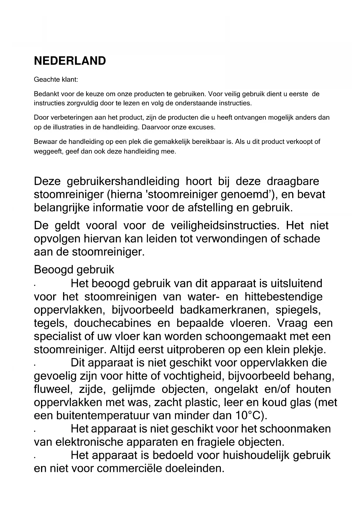 Het beoogd gebruik van dit apparaat is uitsluitend voor het stoomreinigen van water- en hittebestendige oppervlakken, bijvoorbeeld badkamerkranen, spiegels, tegels, douchecabines en bepaalde vloeren. Vraag een specialist of uw vloer kan worden schoongemaakt met een stoomreiniger. Altijd eerst uitproberen op een klein plekje.