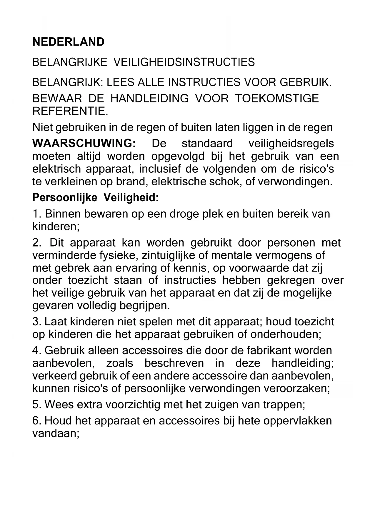 1. Dit apparaat is alleen ontworpen voor huishoudelijk droog stofzuigen;