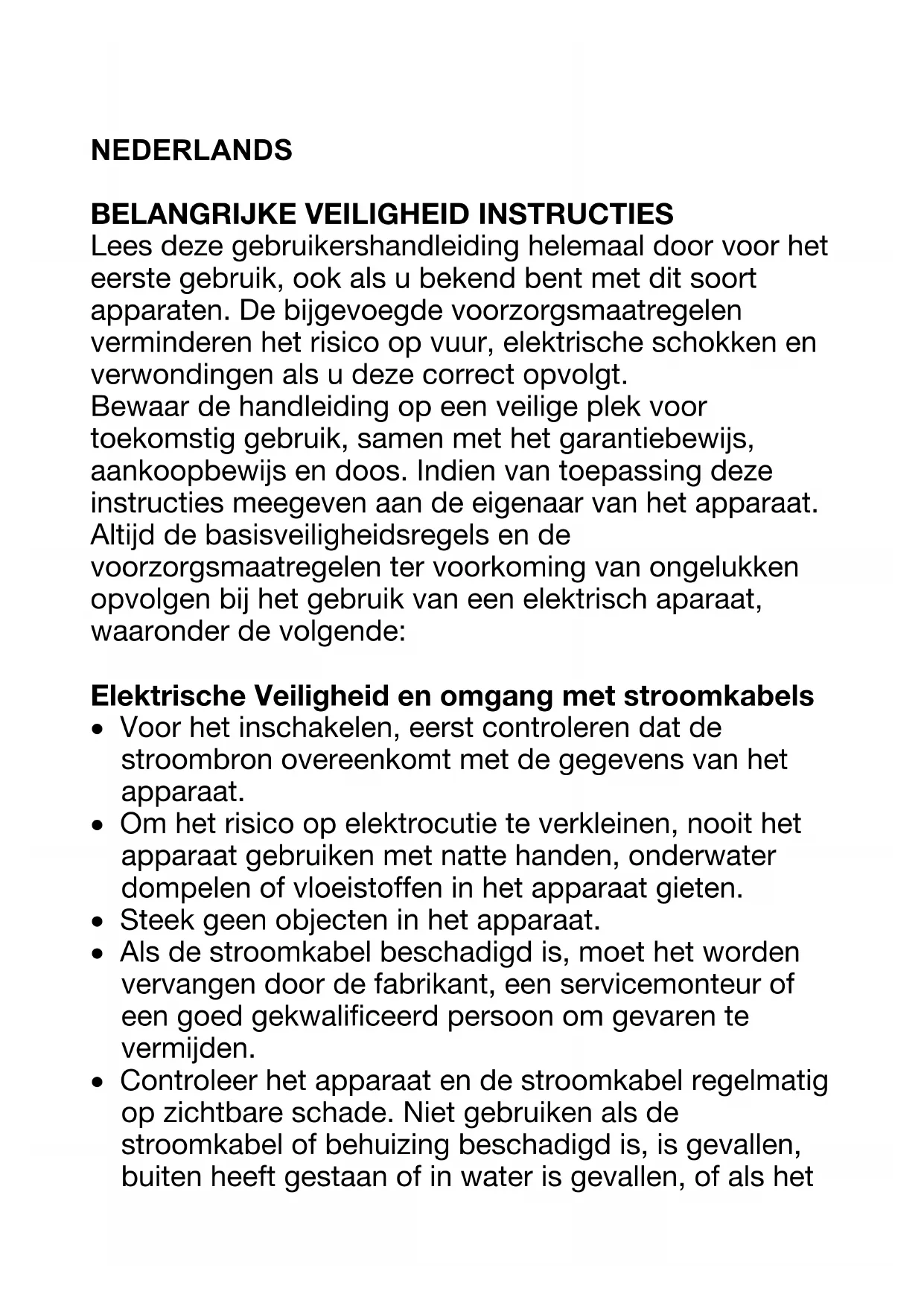 Lees deze gebruikershandleiding helemaal door voor het eerste gebruik, ook als u bekend bent met dit soort apparaten. De bijgevoegde voorzorgsmaatregelen verminderen het risico op vuur, elektrische schokken en verwondingen als u deze correct opvolgt. Bewaar de handleiding op een veilige plek voor toekomstig gebruik, samen met het garantiebewijs, aankoopbewijs en doos. Indien van toepassing deze instructies meegeven aan de eigenaar van het apparaat. Altijd de basisveiligheidsregels en de voorzorgsmaatregelen ter voorkoming van ongelukken opvolgen bij het gebruik van een elektrisch aparaat, waaronder de volgende: Elektrische Veiligheid en omgang met stroomkabels
