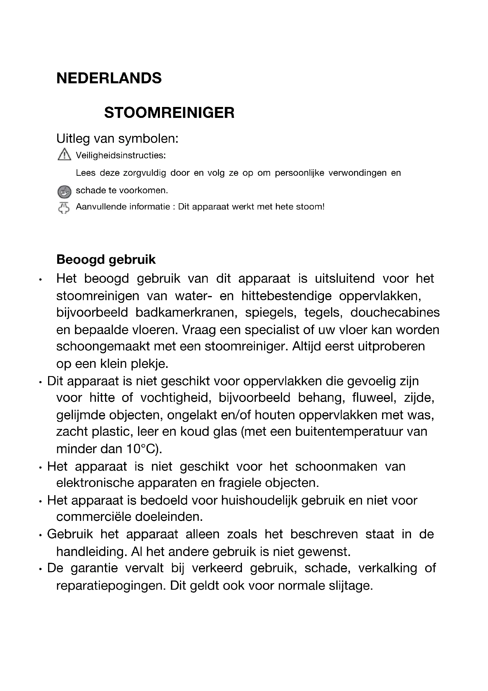 - De garantie vervalt bij verkeerd gebruik, schade, verkalking of reparatiepogingen. Dit geldt ook voor normale slijtage. Veiligheidsinstructies: Lees deze zorgvuldig door en volg ze op om persoonlijke verwondingen en schade te voorkomen. Aanvullende informatie : Dit apparaat werkt met hete stoom!Veiligheidsinstructies Gevaar op verwondingen