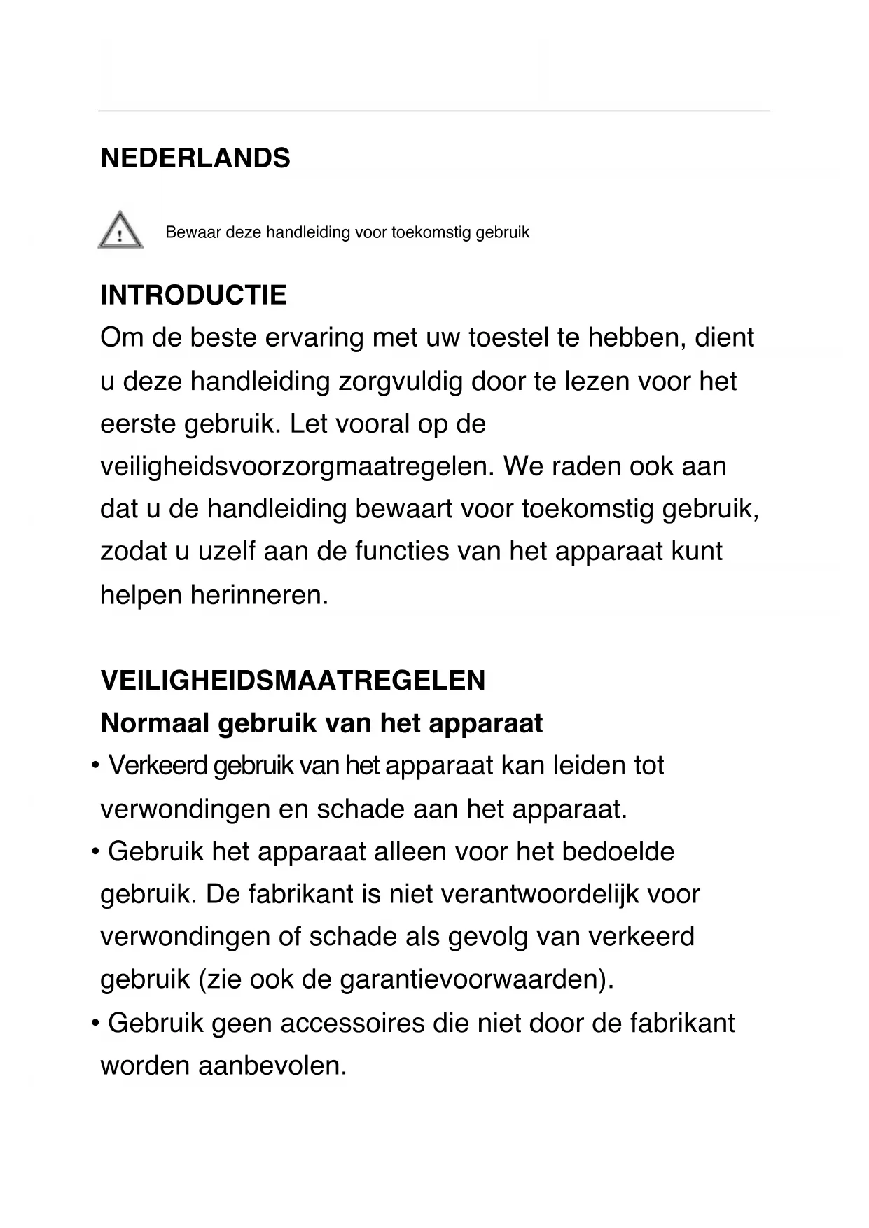 Bewaar deze handleiding voor toekomstig gebruik INTRODUCTIE Om de beste ervaring met uw toestel te hebben, dient u deze handleiding zorgvuldig door te lezen voor het eerste gebruik. Let vooral op de veiligheidsvoorzorgmaatregelen. We raden ook aan dat u de handleiding bewaart voor toekomstig gebruik, zodat u uzelf aan de functies van het apparaat kunt helpen herinneren. VEILIGHEIDSMAATREGELEN Normaal gebruik van het apparaat