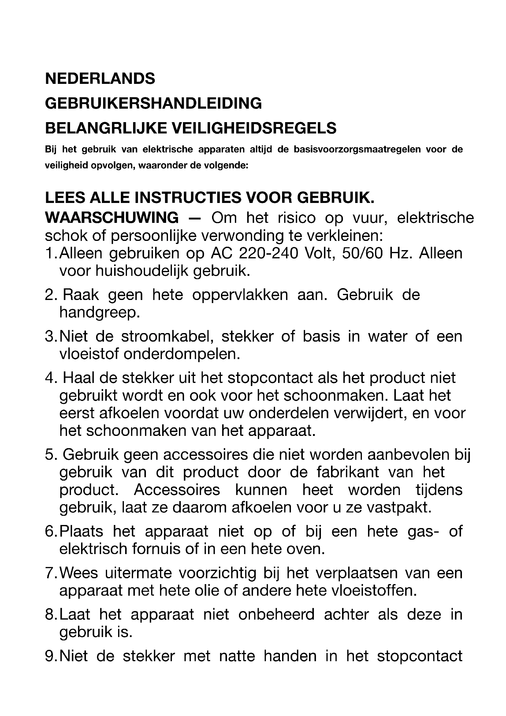 1. Alleen gebruiken op AC 220-240 Volt, 50/60 Hz. Alleen