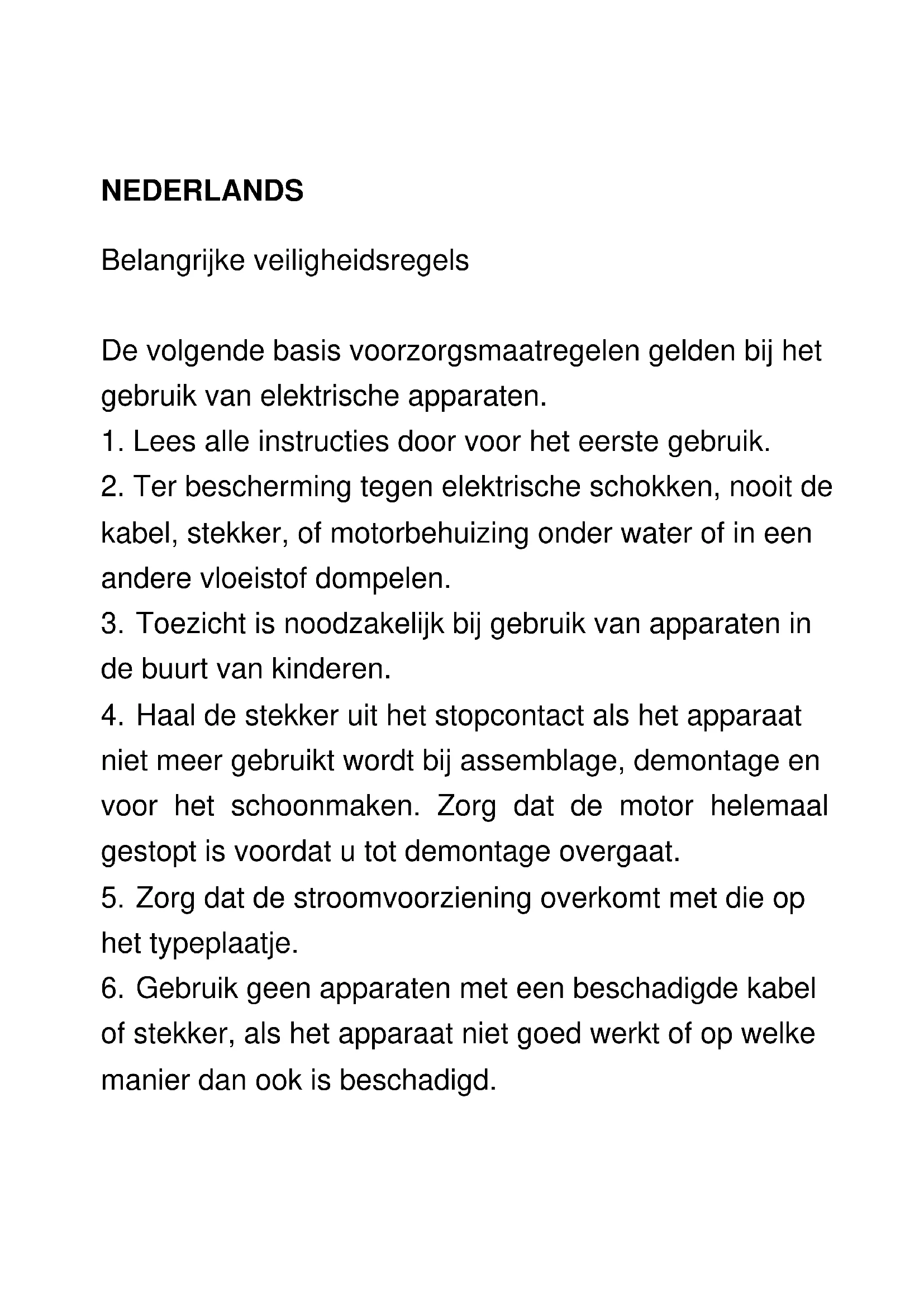 Ter bescherming tegen elektrische schokken, nooit de kabel, stekker, of motorbehuizing onder water of in een andere vloeistof dompelen.