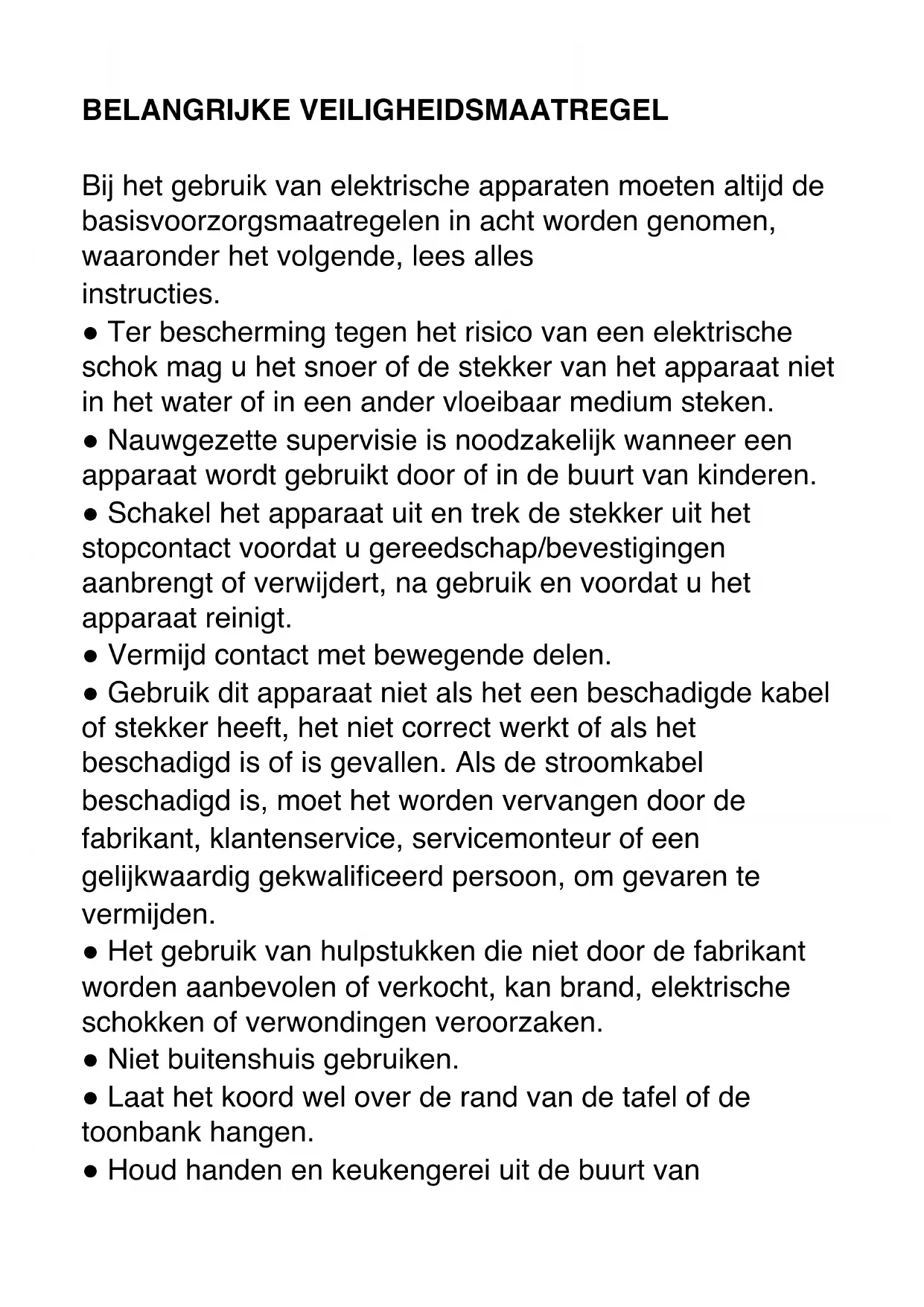 Adeva SAS / H.Koenig Europe - 8 rue Marc Seguin, 77290 Mitry-Mory, France www.hkoenig.com - https://kundenservice.hkoenig.com - Tél: +33 1 64 67 00 05NEDERLANDSBELANGRIJKE VEILIGHEIDSMAATREGEL Bij het gebruik van elektrische apparaten moeten altijd de basisvoorzorgsmaatregelen in acht worden genomen, waaronder het volgende, lees alles instructies. ! Ter bescherming tegen het risico van een elektrische schok mag u het snoer of de stekker van het apparaat niet in het water of in een ander vloeibaar medium steken. ! Nauwgezette supervisie is noodzakelijk wanneer een apparaat wordt gebruikt door of in de buurt van kinderen. ! Schakel het apparaat uit en trek de stekker uit het stopcontact voordat u gereedschap/bevestigingen aanbrengt of verwijdert, na gebruik en voordat u het apparaat reinigt. ! Vermijd contact met bewegende delen. ! Gebruik dit apparaat niet als het een beschadigde kabel of stekker heeft, het niet correct werkt of als het beschadigd is of is gevallen. Als de stroomkabel beschadigd is, moet het worden vervangen door de fabrikant, klantenservice, servicemonteur of een gelijkwaardig gekwalificeerd persoon, om gevaren te vermijden. ! Het gebruik van hulpstukken die niet door de fabrikant worden aanbevolen of verkocht, kan brand, elektrische schokken of verwondingen veroorzaken. ! Niet buitenshuis gebruiken. ! Laat het koord wel over de rand van de tafel of de toonbank hangen. ! Houd handen en keukengerei uit de buurt vanbewegende messen of schijven tijdens het verwerken van voedsel om het risico op ernstig letsel voor personen of schade aan de voedselmixer te verminderen. ! Om het risico op letsel te verminderen, mag u nooit snijbladen of -schijven op de basis plaatsen. ! Schakel de machine uit voordat u het hulpstuk vervangt. ! Gebruik het product en monteer het accessoire alleen zoals vermeld in de gebruikershandleiding. ! Schakel het apparaat uit voordat u accessoires vervangt of onderdelen nadert die tijdens het gebruik bewegen. ! Dit apparaat kan worden gebruikt door personen met verminderde fysieke, zintuiglijke of mentale vermogens of met gebrek aan ervaring of kennis, op voorwaarde dat zij onder toezicht staan of instructies hebben gekregen over het veilige gebruik van het apparaat en dat zij de mogelijke gevaren volledig begrijpen. ! Kinderen moeten onder toezicht staan om ervoor te zorgen dat ze niet met het apparaat spelen. ! Het apparaat is niet bedoeld om te worden bediend door middel van een externe timer of een afstandsbediening. ! Gebruik dit apparaat niet als het een beschadigde kabel of stekker heeft, het niet correct werkt of als het beschadigd is of is gevallen. Als de stroomkabel beschadigd is, moet het worden vervangen door de fabrikant, klantenservice, servicemonteur of een gelijkwaardig gekwalificeerd persoon, om gevaren te vermijden. ! Het apparaat mag niet worden gebruikt als het is gevallen, er zijn duidelijke tekenen van schade zichtbaar of er zijn lekken. ! Dit apparaat mag worden gebruikt door kinderen vanaf 8jaar en ouder indien dit gebeurt onder toezicht,als zij van tevoren instructies hebben ontvangen betreffende het veilige gebruik van het apparaat en als zij de mogelijke gevaren kennen. ! Reiniging en onderhoud mogen niet worden uitgevoerd door kinderen tenzij ze 8 jaar of ouder zijn en onder toezicht van een volwassene staan. ! Houd het apparaat en het snoer buiten bereik van kinderen onder de 8 jaar. ! Bij het gebruik van elektrische apparatuur moeten altijd veiligheidsmaatregelen worden genomen om het risico van brand, elektrische schokken en/of letsel in geval van verkeerd gebruik te voorkomen. ! Controleer of de spanning op het typeplaatje overeenkomt met de spanning die op het typeplaatje staat van uw installatie. Als dit niet het geval is, neem dan contact op met de dealer en sluit het apparaat niet aan. ! Laat het apparaat nooit onbeheerd achter terwijl het in bedrijf is. ! Bewaar dit document bij de hand en geef het aan de toekomstige eigenaar in geval van overdracht van uw apparaat. ! Zorg ervoor dat de stekker uit het stopcontact is gehaald voordat u de blender reinigt. ! Het apparaat is niet bedoeld om te worden bediend door externe timermiddelen of een afstandsbedieningssysteem. ! Dit apparaat is alleen bedoeld voor huishoudelijk en binnengebruik. ! Uw apparaat is uitsluitend ontworpen voor huishoudelijk gebruik. Het is niet bedoeld voor gebruik in de volgende situaties, die niet onder de garantie vallen:- in personeelskeukens in winkels, kantoren en andere professionele omgevingen, - in boerderijherbergen, - door gasten in hotels, motels en andere residentiële omgevingen, - in bed & breakfast-omgevingen. Bewaar deze instructiesBEDIENINGSKNOPPEN