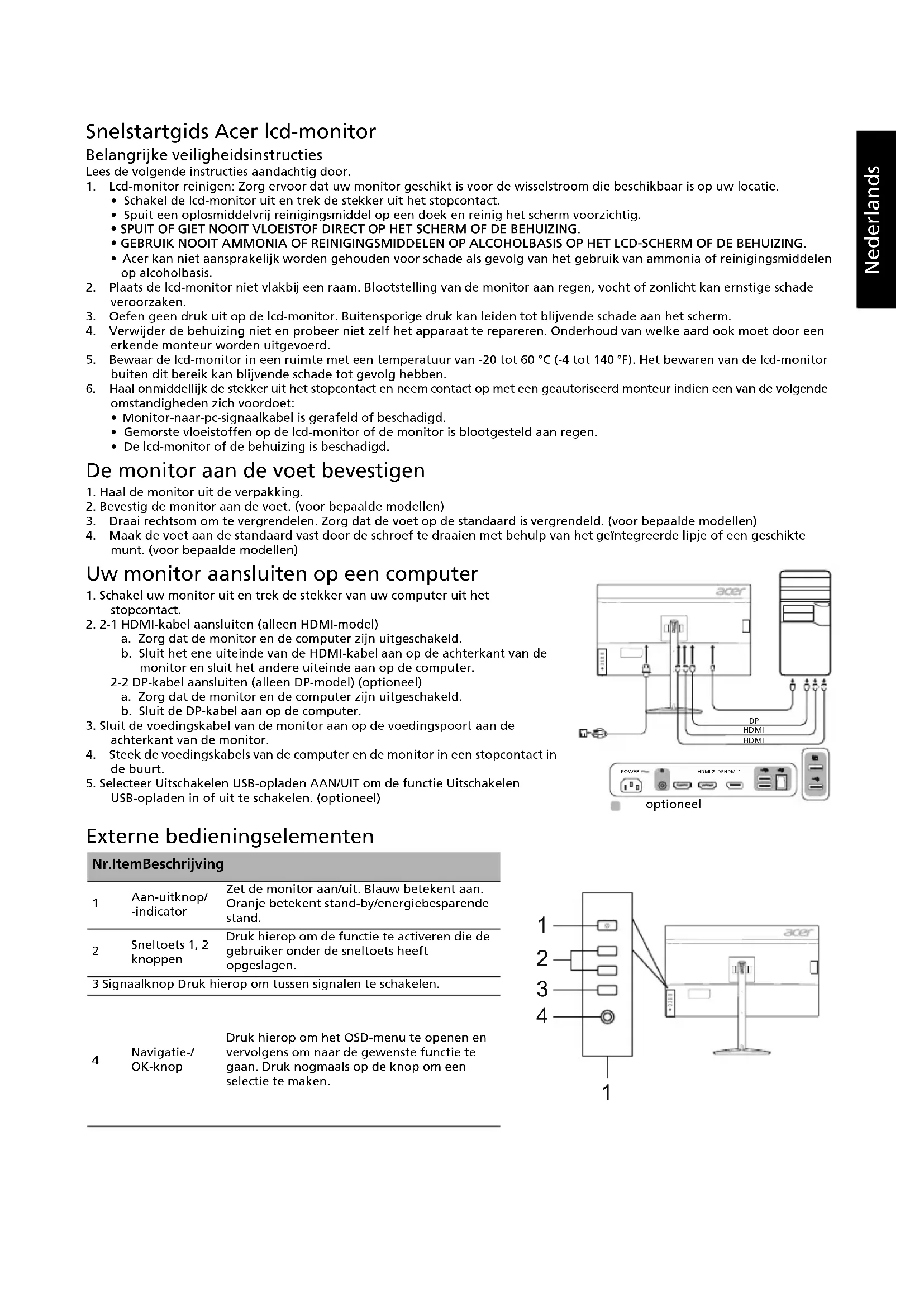 Contrast 100000000:1 Max (ACM) Kijkhoek 178° (H) 178° (V) (CR=10) Reactietijd 1 ms (G-to-G) / 0,5 ms (G-to-G, min.) Type beeldscherm In-Plane Switching Horizontale frequentie HDMI: 31 - 222 kHz / DP: 31 - 395 kHz Verticale frequentie HDMI: 56 - 144 Hz / DP: 56 - 270 Hz Kleuren 16,7 miljoen Dot Clock HDMI: 595,5 MHz / DP: 1056,97 MHz Maximale resolutie HDMI: 2560 x 1440 bij 144 Hz / DP: 2560 x 1440 bij 240 Hz DP: 2560 x 1440 bij 270 Hz (met Overklokken AAN) Plug en play VESA DDCCI/DDC2B Energie-efficiëntieklasse C *Jaarlijks energieverbruik 86 (kWh) (voor een HDMI-model) Energieverbruik (bij 200 nits) Aan 45 W (standaard) Slaapmodus 0,45 W (standaard) Uit 0,3 W (standaard) Ingangsconnector HDMI (alleen HDMI-model) / DP (alleen DP-model) Ingang videosignaal HDMI (alleen HDMI-model) (optioneel) / DP (alleen DP-model) (optioneel) Luidsprekers 2 W x 2 (alleen Audio-model) (optioneel) USB USB 3.0 x 4 (optioneel) Maximale schermgrootte Horizontaal: 708,4 mm Verticaal: 398,5 mm Voedingsbron 100-240 V, 50/60 Hz Milieuoverwegingen Bedrijfstemperatuur: 0 tot 40 °C Opslagtemperatuur: -20 tot 60 °C Bedrijfsvochtigheid: 20% tot 80% Afmetingen 727,48 (B) x 479,18 ~ 609,18 (H) x 269 (D) mm Gewicht 9,5 kg (netto) Specificaties mechanisme Kantelen: -5° tot +35° (alleen op het hoogste punt is 35 graden naar achteren kantelen mogelijk) Zwenken: 360° Verstellen hoogte: 0 tot 130 mm Draaien: Nee Afneembare voet: Ja Externe bedieningselementen Schakelaar/knoppen Aan/Uit-knop Sneltoets 1 Sneltoets 2 Ingang Menu/Navigatie/OK Functies Helderheid Contrast Blauw licht Zwartversterking ACM HDR*** Superscherpte Gamma Kleurtemp. Modi Kleurruimte Grijswaarden 6-assige tint 6-as verzadigen Volume Dempen Over Drive FreeSync Premium** Vernieuwingst. Ultralage latentie Richtpunt Taal Time-out OSD Transparantie OSD vergrendelen Ingang Autom. bron DP-formaat Sneltoetstoewijzing Breedbeeldmodus PIP/PBP DDC/CI HDMI zwartniveau Snelstartmodus Overklokken# Uitschakelen USB-opladen Scherminformatie Alle inst. Resetten Afsluiten Specificaties kunnen per regio en/of model verschillen.Polski Skrócona instrukcja uruchamiania monitora LCD firmy Acer Ważne instrukcje dotyczące bezpieczeństwa Należy uważnie przeczytać poniższe instrukcje. 1. W celu wyczyszczenia ekranu monitora LCD: Należy upewnić się, czy monitor przystosowany jest do zasilania prądem przemiennym dostępnym w miejscu użytkowania.• Wyłączyć monitor LCD i odłączyć przewód zasilający.