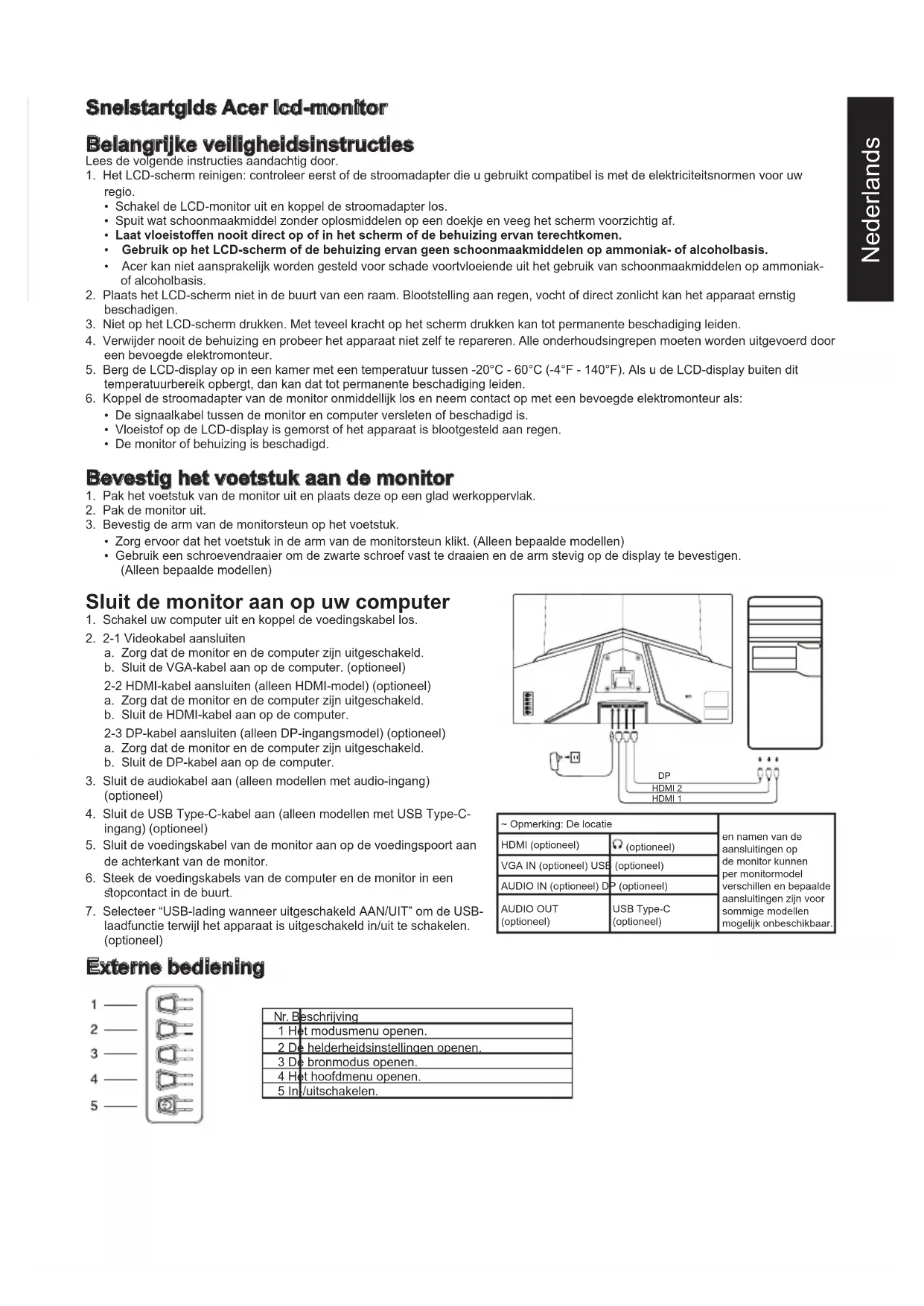 (standaard) Contrast 100000000:1 Max (ACM) Weergavehoek 178° (H) 178° (V) (CR=10) Reactietijd 1 ms (VRB) Schermtype VA H-frequentie HDMI: 31,469 - 291,309 KHz DP: 31,469 - 291,309 KHz V-frequentie HDMI: 48 - 240 Hz DP: 48 - 240 Hz Kleuren 16,7 M kleur Dotklok HDMI: 594,270 MHz DP: 594,270 MHz Maximale resolutie HDMI: 1920 × 1080 @ 240 Hz DP: 1920 × 1080 @ 240 Hz Plug & Play VESA DDCCI/DDC2B Vermogensverbruik Ingeschakelde modus 32 W (typisch) Slaapmodus 0,5 W (typisch) Uit 0,3 W (typisch) Ingangsconnector HDMI (alleen HDMI-model) x 2 (optioneel) DP (alleen DP-model) (optioneel) Invoer videosignaal HDMI (alleen modellen met HDMI-ingang) DP (alleen DP-model) (optioneel) Luidsprekers 2 W x 2 (alleen Audio-model) (optioneel) Maximale schermgrootte Horizontaal: 698 mm Verticaal: 393 mm Voedingsbron INGANG: 100-240 V ~ 50/60 Hz Omgevingsvoorwaarden Bedrijfstemp.: 0° tot 40°C Opslagtemp.: -20° tot 60°C Gebruiksvochtigheid: 20% tot 80% Afmetingen 709,4 (B) x 513,9 (H) x 199,1 (D) mm Gewicht (netto) 4,9 kg (netto) Mechanismespecificaties Kantelen: -5° tot +20° Draaien: Nee Hoogteafstelling: Nee Roteren: Nee Verwijderbare voet: Ja Externe bediening Schakelaar/toetsen Hotkey 1 Hotkey 2 Hotkey 3 Hotkey 4 Aan-/uitknop Functies Helderheid Contrast Blauw licht Zwartversterking ACM Superscherpte Gamma Kleurtemp. Modi sRGB-modus Grijswaarden 6-assige tint 6-as verzadigen Volume Dempen Over Drive Adaptive-Sync Vernieuwingst. VRB Richtpunt Taal Time-out OSD Doorzichtigheid OSD vergrendelen Ingang Autom. Bron DP-formaat Sneltoetstoewijzing Breedbeeldmodus DDC/CI HDMI zwartniveau Snelstartmodus Informatie Alle inst. Resetten Specificaties kunnen per regio en/of model verschillen. Handleidingen en andere documenten voor uw Acer-product kunt u vinden op de officiële Acer-ondersteuningswebsite.Polski Skrócona instrukcja uruchamiania monitora LCD firmy Acer Ważne instrukcje dotyczące bezpieczeństwa Należy uważnie przeczytać poniższe instrukcje. 1. Czyszczenie ekranu LCD: najpierw upewnij się, że zasilacz, którego używasz spełnia standardy elektryczne dla Twojego regionu.