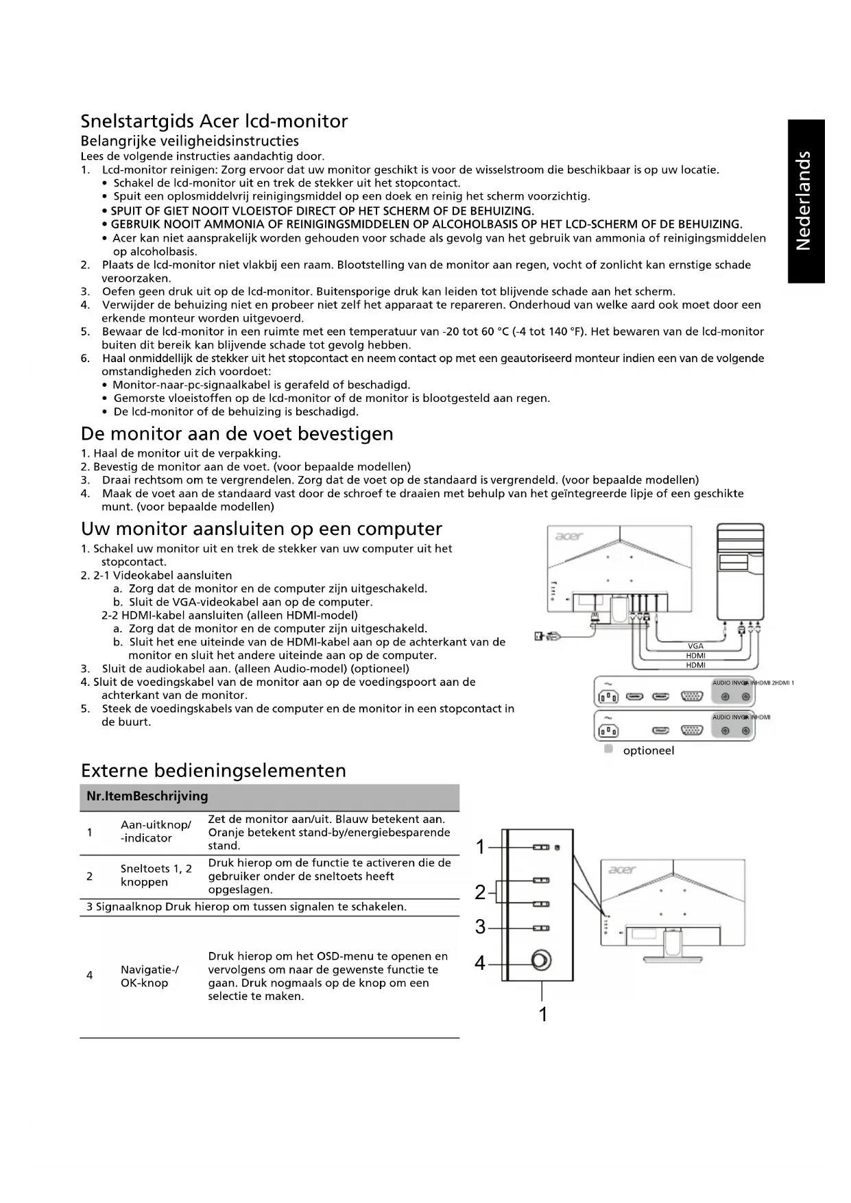 (Tipica) Contrasto 100000000:1 Max (ACM) Angolo di visualizzazione 178° (O) 178° (V) (CR=10) Tempo di risposta 1 ms (VRB) Video Interfaccia analogica R, G, B Tipo di pannello VA Frequenza H 30 - 85 kHz Frequenza V 56 - 76 Hz Colori del display 16,7 milioni Dot Clock 174,5 MHz Risoluzione massima VGA: 1920 x 1080 @ 75 Hz HDMI: 1920 x 1080 @ 75 Hz Plug & Play VESA DDCCI/DDC2B Consumo energetico (a 200 nits) Modalità on 26 W Modalità sospensione 0,5 W Modalità off 0,3 W Connettore di ingresso D-Sub HDMI (solo nei modelli con ingresso HDMI) Segnale video in ingresso Analogico: 0,7 Vp-p (standard), 75 OHM, Positivo HDMI (solo nei modelli con ingresso HDMI) (Opzionale) Altoparlanti 2 W x 2 (solo nei modelli con ingresso audio) (Opzionale) Dimensione massima dello schermo Orizzontale: 597,6 mm Verticale: 336,1 mm Fonte di alimentazione 100-240V, 50/60 Hz Considerazioni ambientali Temperatura operativa: Da 0° a 40 °C Temperatura di stoccaggio: Da -20° a 60 °C Umidità operativa: Da 20% a 80% Dimensioni 614,3 (L) x 440,62 (A) x 248,98 (P) mm Peso (N. W.) 5,4 kg (netto) Specifiche meccaniche Inclinazione: Da -5° a +20° Rotazione: No Regolazione dell'altezza: No Perno: No Piedistallo scollegabile: Sì Controlli esterni Switch/Pulsanti Pulsante di alimentazione Tasto 1 Tasto 2 Input Menu/Navigazione/OK Funzioni Luminosità Contrasto Spia blu Potenz. nero ACM Nitidezza alta O.Posizione (solo nei modelli con ingresso analogico) V.Posizione (solo nei modelli con ingresso analogico) Orologio (solo nei modelli con ingresso analogico) Nitidezza (solo nei modelli con ingresso analogico) Autoregolazione (solo nei modelli con ingresso analogico) Gamma Temp. Colore Modalità Mod sRGB Scala di grigi Tonal. 6 assi Satur. 6 assi Volume Mute Over Drive FreeSync Num freq aggiorn VRB Lingua Intervallo OSD Trasparenza Blocco OSD Input Origine auto Assegnazione tasti Schermo intero DDC/CI Liv nero HDMI Mod Avvio rapido Informazioni sul display Ripristina tutto Uscita Le specifiche variano a seconda della regione e/o del modello.Nederlands Snelstartgids Acer lcd-monitor Belangrijke veiligheidsinstructies Lees de volgende instructies aandachtig door.