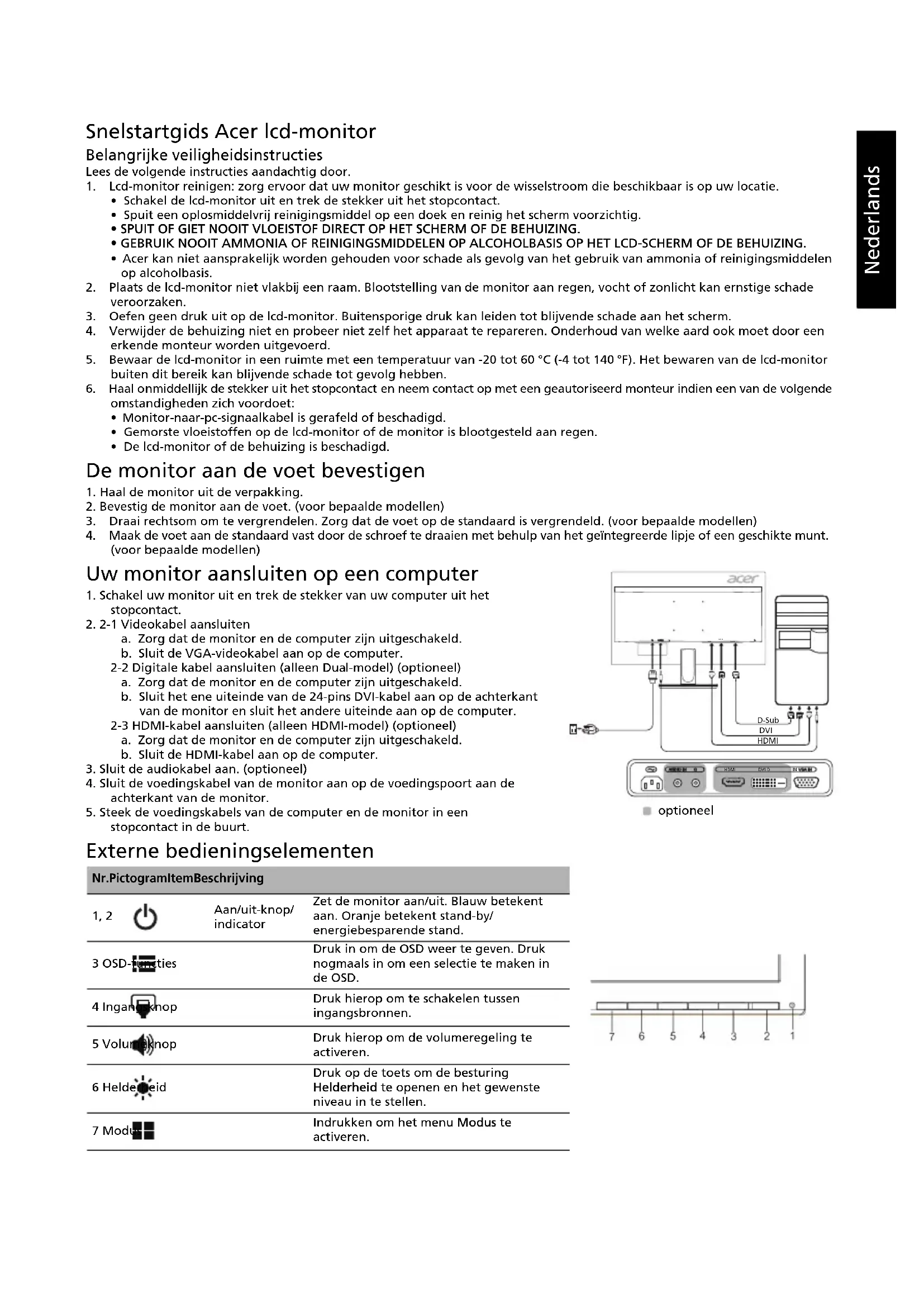 HDMI D-Sub DVI optioneelNederlands Wetgeving en veiligheidsvoorschriften Kennisgeving FCC Dit apparaat is getest en voldoet aan de limieten voor een digitaal apparaat van Klasse B overeenkomstig deel 15 van de FCC- voorschriften. Deze limieten zijn opgesteld om een redelijke bescherming te bieden tegen schadelijke interferentie bij installatie in een woonomgeving. Dit apparaat genereert en gebruikt radiofrequentie-energie en kan deze energie uitstralen en, indien niet geïnstalleerd en gebruikt in overeenstemming met de instructies, schadelijke storing veroorzaken aan radiocommunicatie. Er is echter geen garantie dat er geen interferentie zal optreden in een bepaalde installatie. Als dit apparaat wel schadelijke interferentie veroorzaakt bij uw radio- of televisieontvangst, wat kan worden vastgesteld door het apparaat uit en in te schakelen, wordt de gebruiker aangemoedigd te proberen de storing te verhelpen door een of meer van de volgende maatregelen: Draai of verplaats de ontvangstantenne. Vergroot de afstand tussen het apparaat en de ontvanger. Sluit het apparaat aan op een ander stopcontact dan waarop de ontvanger is aangesloten. Raadpleeg de dealer of een ervaren radio/tv-technicus voor hulp. CE-verklaring van conformiteit Hierbij verklaart Acer Inc. dat deze lcd-monitor voldoet aan de essentiële vereisten en andere relevante bepalingen van de EMC- richtlijn 2014/30/EU, laagspanningsrichtlijn 2014/35/EU en RoHS-richtlijn 2011/65/EU en richtlijn 2009/125/EG betreffende de totstandbrenging van een kader voor het vaststellen van eisen inzake ecologisch ontwerp voor energiegerelateerde producten. Kennisgeving: Om schade aan de monitor te voorkomen dient u die niet aan de basis op te tillen. Bericht: afgeschermde kabels Alle verbindingen met andere computers moeten worden gemaakt met afgeschermde kabels om te voldoen aan de EMC-voorschriften. Bericht: randapparatuur Alleen randapparatuur (input/output-apparaten, terminals, printers, enz.) gecertificeerd om te voldoen aan de Klasse B-limieten kunnen worden verbonden aan deze apparatuur. Werken met niet-gecertificeerde randapparatuur kan leiden tot interferentie met radio en tv-ontvangst. Waarschuwing Wijzigingen of aanpassingen die niet uitdrukkelijk zijn goedgekeurd door de fabrikant kunnen tot gevolg hebben dat het recht van de gebruiker om dit product te gebruiken, dat wordt toegekend door de Federal Communications Commission (FCC), vervalt. Bedrijfsomstandigheden Dit apparaat voldoet aan deel 15 van de FCC-voorschriften. Werking is onderhevig aan de volgende twee voorwaarden: (1) dit apparaat mag geen schadelijke interferentie veroorzaken, en (2) dit apparaat moet elke ontvangen interferentie accepteren, inclusief interferentie die ongewenste werking kan veroorzaken. Bericht: Canadese gebruikers Dit digitale apparaat van Klasse B voldoet aan de Canadese norm ICES-003. Remarque à l'intention des utilisateurs canadiens Cet appareil numérique de la classe B est conforme à la norme NMB-003 du Canada. Afvoer van afgedankte apparatuur door Gebruikers in particuliere huishoudens in de Europese Unie Dit symbool op het product of op de verpakking geeft aan dat dit product niet mag worden weggegooid bij het andere huisvuil. Het is uw verantwoordelijkheid om uw afgedankte apparatuur aan te bieden bij een daartoe aangewezen inzamelpunt voor recycling van afgedankte elektrische en elektronische apparatuur. Gescheiden inzamelen en recyclen van uw afgedankte apparatuur helpt natuurlijke hulpbronnen te sparen en garandeert dat uw apparatuur wordt gerecycled op een manier die niet schadelijk is voor de menselijke gezondheid en het milieu. Meer informatie over waar u afgedankte apparatuur voor recycling kunt aanbieden kunt u opvragen bij de gemeente, de relevante dienst voor de verwerking van huishoudelijk afval of de winkel waar u het product hebt gekocht.Nederlands SPECIFICATIE Zoek handleidingen en andere documenten voor uw Acer-product op de officiële ondersteuningswebsite van Acer. *Jaarlijks energieverbruik wordt berekend op basis van standaard stroomverbruik 4 uur per dag, 365 dagen per jaar. Lcd-paneel Aandrijfsysteem TFT lcd-kleurenscherm Grootte 23,8”W (60 cm) Pixelgrootte 0,2745 mm (H) x 0,2745 mm (V) Helderheid 250 cd/m