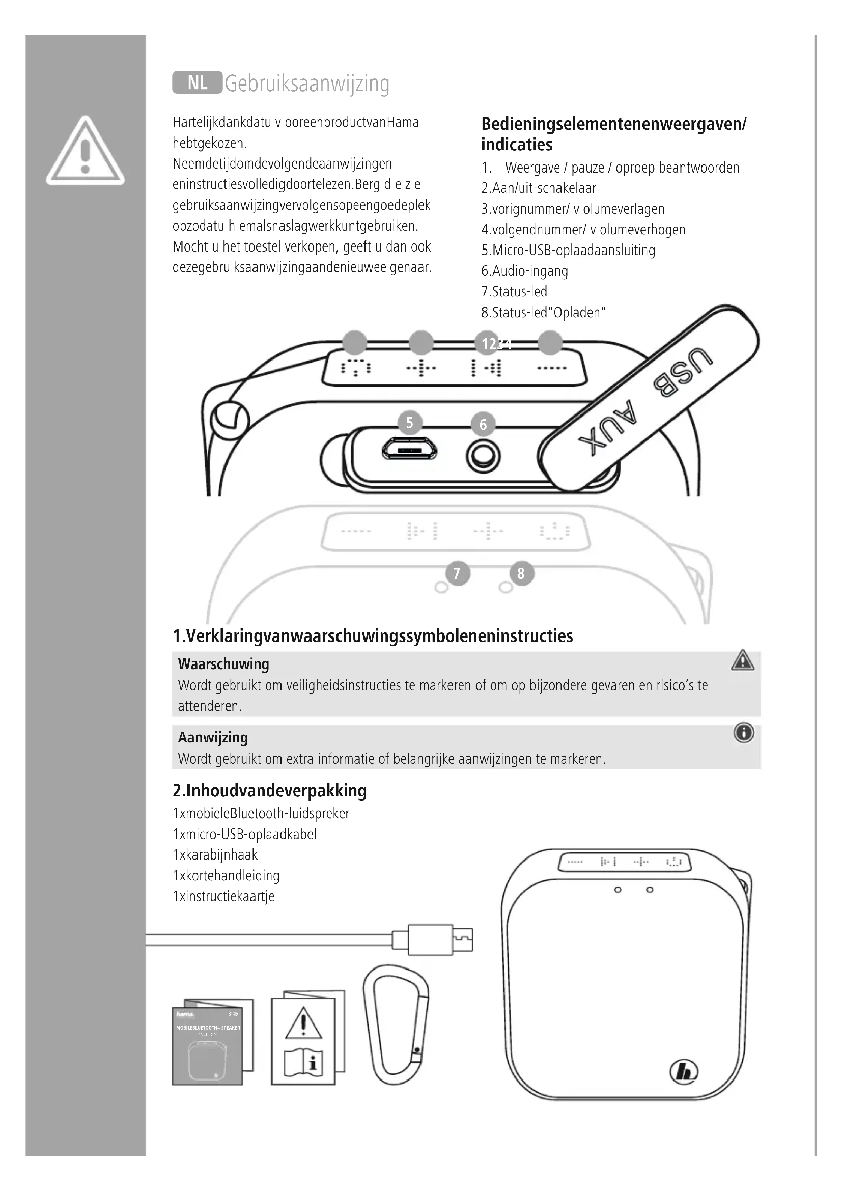 SPEAKER “Pocket 2.0” Hartelijk dank dat uvoor een product van Hama hebt gekozen. Neem de tijd om de volgende aanwijzingen en instructies volledig door te lezen. Bergdeze gebruiksaanwijzing vervolgens op een goede plek op zodat uhem als naslagwerk kunt gebruiken. Mocht uhet toestel verkopen, geeft udan ook deze gebruiksaanwijzing aan de nieuwe eigenaar. Bedieningselementen en weergaven/ indicaties