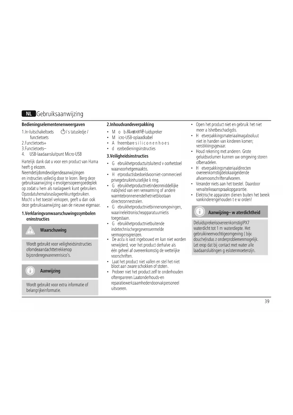 - Elektrischeapparaten dienen buiten hetbereik van kinderen gehoudenteworden! Aanwijzing –waterdichtheid De luidspreker is overeenkomstig IPX7 waterdichttot 1mwaterdiepte. Het gebruik in een vochtige omgeving(bijv. douche) is duszonder problemen mogelijk. Leteropdat bij contact metwater alle laadaansluitingengesloten moeten zijn. N Gebruiksaanwijzing40
