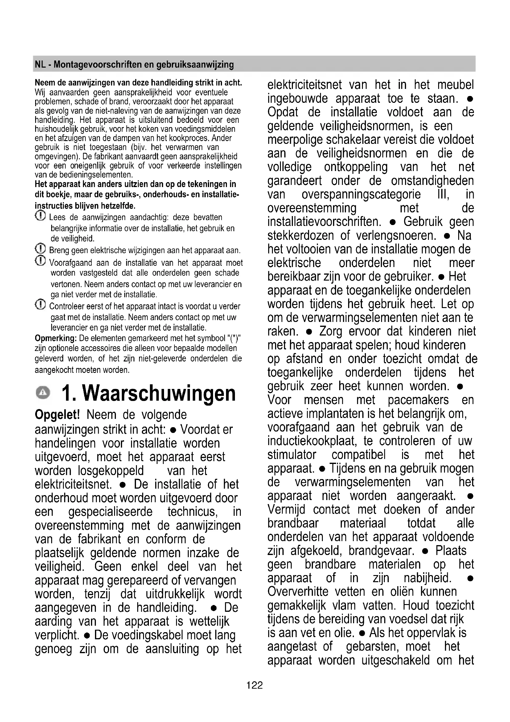 Opgelet! Neem de volgende aanwijzingen strikt in acht: ● Voordat er handelingen voor installatie worden uitgevoerd, moet het apparaat eerst worden losgekoppeld van het elektriciteitsnet. ● De installatie of het onderhoud moet worden uitgevoerd door een gespecialiseerde technicus, in overeenstemming met de aanwijzingen van de fabrikant en conform de plaatselijk geldende normen inzake de veiligheid. Geen enkel deel van het apparaat mag gerepareerd of vervangen worden, tenzij dat uitdrukkelijk wordt aangegeven in de handleiding. ● De aarding van het apparaat is wettelijk verplicht. ● De voedingskabel moet lang genoeg zijn om de aansluiting op het elektriciteitsnet van het in het meubel ingebouwde apparaat toe te staan. ● Opdat de installatie voldoet aan de geldende veiligheidsnormen, is een meerpolige schakelaar vereist die voldoet aan de veiligheidsnormen en die de volledige ontkoppeling van het net garandeert onder de omstandigheden van overspanningscategorie III, in overeenstemming met de installatievoorschriften. ● Gebruik geen stekkerdozen of verlengsnoeren. ● Na het voltooien van de installatie mogen de elektrische onderdelen niet meer bereikbaar zijn voor de gebruiker. ● Het apparaat en de toegankelijke onderdelen worden tijdens het gebruik heet. Let op om de verwarmingselementen niet aan te raken. ● Zorg ervoor dat kinderen niet met het apparaat spelen; houd kinderen op afstand en onder toezicht omdat de toegankelijke onderdelen tijdens het gebruik zeer heet kunnen worden. ● Voor mensen met pacemakers en actieve implantaten is het belangrijk om, voorafgaand aan het gebruik van de inductiekookplaat, te controleren of uw stimulator compatibel is met het apparaat. ● Tijdens en na gebruik mogen de verwarmingselementen van het apparaat niet worden aangeraakt. ● Vermijd contact met doeken of ander brandbaar materiaal totdat alle onderdelen van het apparaat voldoende zijn afgekoeld, brandgevaar. ● Plaats geen brandbare materialen op het apparaat of in zijn nabijheid. ● Oververhitte vetten en oliën kunnen gemakkelijk vlam vatten. Houd toezicht tijdens de bereiding van voedsel dat rijk is aan vet en olie. ● Als het oppervlak is aangetast of gebarsten, moet het apparaat worden uitgeschakeld om het123 gevaar op elektrische schokken te voorkomen. ● Het apparaat mag niet door een externe timer of een afzonderlijk systeem voor afstandsbediening in bedrijf worden gesteld. ● Een onbewaakt kookproces met olie of vet op een kookplaat kan gevaarlijk zijn en brand veroorzaken. ● Het kookproces moet altijd bewaakt worden. Een kort kookproces moet constant bewaakt worden. ● Probeer NOOIT om vlammen met water te blussen. In plaats daarvan moet het apparaat worden uitgeschakeld en moeten de vlammen gedoofd worden met, bijvoorbeeld, een deksel of een blusdeken. Brandgevaar: plaats geen voorwerpen op de kookoppervlakken. ● Gebruik geen stoomreinigers: risico op een elektrische schok. ● Plaats geen metalen voorwerpen zoals messen, vorken, lepels en deksels op het oppervlak van de kookplaat omdat ze oververhit zouden kunnen raken. ● Alvorens het apparaat op het elektriciteitsnet aan te sluiten: controleer het typeplaatje (op de onderkant van het apparaat) om er zeker van te zijn dat de spanning en het vermogen overeenkomen met die van het elektriciteitsnet en controleer of het stopcontact geschikt is. Neem in geval van twijfel contact op met een gekwalificeerde elektricien. Belangrijk: ● Schakel de kookplaat na gebruik uit door middel van het bedieningspaneel en vertrouw daarbij niet op de pan-detector. ● Om het morsen van vloeistoffen te voorkomen moet, voor het koken of verwarmen van vloeistoffen, de warmtetoevoer beperkt worden. ● Laat de verwarmingselementen niet ingeschakeld met lege pannen of potten, of zonder pannen. ● Na beëindiging van het kookproces moet de betreffende kookzone worden uitgeschakeld. ● Gebruik bij het koken nooit vellen aluminiumfolie en plaats nooit rechtstreeks met aluminium verpakte producten. Aluminium zou kunnen smelten en uw apparaat onherstelbaar beschadigen. ● Warm nooit een blikje met voedingsmiddelen op zonder het eerst te openen: het zou kunnen ontploffen! Deze waarschuwing geldt voor alle andere soorten kookplaten. ● Het gebruik van een hoog vermogen, zoals de functie Booster, is niet geschikt voor het verwarmen van bepaalde vloeistoffen, zoals bijvoorbeeld bakolie. De overmatige hitte zou gevaarlijk kunnen zijn. In dit geval raden wij het gebruik van een lager vermogen aan. ● De pannen moeten rechtstreeks op de kookplaat en in het midden van de kookzones worden geplaatst. Plaats in geen geval andere voorwerpen tussen de pan en de kookplaat. ● In geval van hoge temperaturen, vermindert het apparaat automatisch het vermogensniveau van de kookzones. ● Voordat u reinigings● of onderhoudswerkzaamheden uitvoert, moet u het apparaat van het stroomnet loskoppelen door de stekker uit het stopcontact te halen of de hoofdschakelaar van het huis uitschakelen. ● Gebruik tijdens alle installatie● en onderhoudshandelingen altijd werkhandschoenen. ● Het apparaat mag gebruikt worden door kinderen vanaf 8 jaar en door personen met verminderde lichamelijke, zintuiglijke of geestelijke vermogens, of personen die niet beschikken over de noodzakelijke ervaring en kennis, mits ze onder toezicht staan of nadat ze aanwijzingen124 hebben ontvangen inzake het veilige gebruik van het apparaat en ze de bij het gebruik betrokken gevaren begrepen hebben. ● Kinderen moeten gecontroleerd worden om ervoor te zorgen dat ze niet met het apparaat spelen. ● De reiniging en het onderhoud mogen niet worden uitgevoerd door kinderen zonder dat ze onder toezicht staan. ● De ruimte moet voldoende worden geventileerd wanneer het apparaat tegelijk met andere apparaten wordt gebruikt die op gas of andere brandstoffen werken. ● Het apparaat moet zowel intern als extern regelmatig worden gereinigd (TENMINSTE EEN KEER PER MAAND), maar volg 