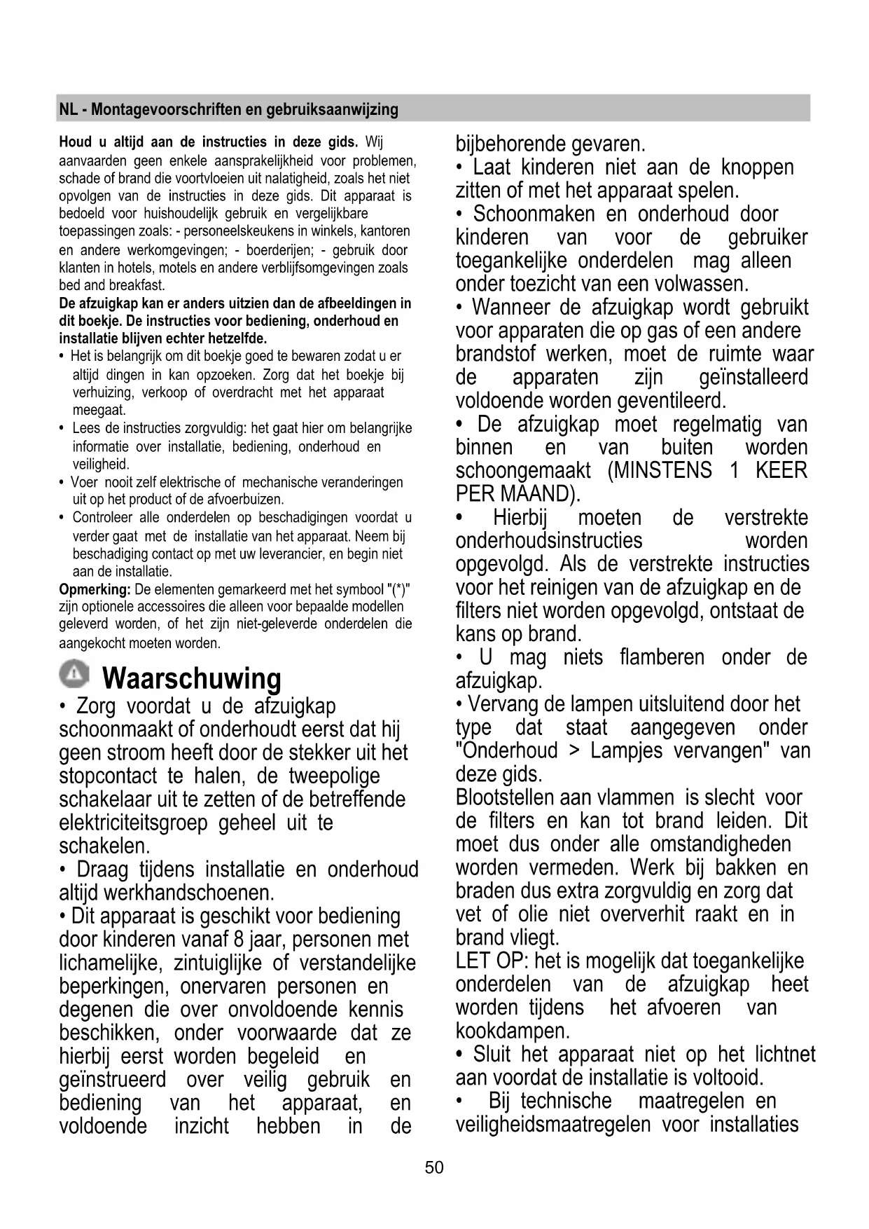 - Hierbij moeten de verstrekte onderhoudsinstructies worden opgevolgd. Als de verstrekte instructies voor het reinigen van de afzuigkap en de filters niet worden opgevolgd, ontstaat de kans op brand.