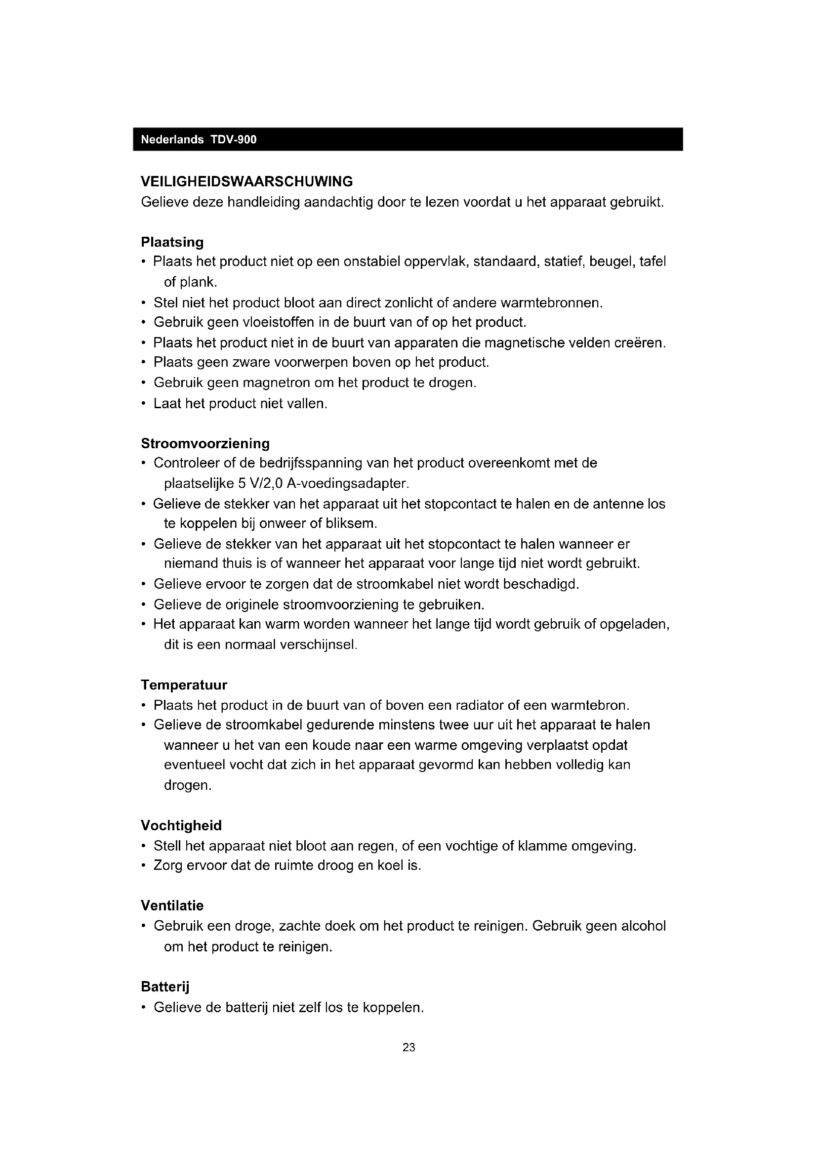 Videosysteem PAL Bedrijfstijd ongeveer 2,5 uur wanneer het apparaat volledig opgeladen is Batterijcapaciteit 4000 mAh/3,7 V Kenmerken en specificaties kunnen zonder voorafgaande kennisgeving worden gewijzigd.42 Garantie Lenco biedt service en garantie aan overeenkomstig met de Europese wetgeving. Dit houdt in dat u, in het geval van reparaties (zowel tijdens als na de garantieperiode), uw lokale handelaar moet contacteren. Belangrijke opmerking: Het is niet mogelijk om producten die moeten worden gerepareerd direct naar Lenco te sturen. Belangrijke opmerking: De garantie verloopt als een onofficieel servicecenter het apparaat op wat voor manier dan ook heeft geopend, of er toegang toe heeft gekregen. Het apparaat is niet geschikt voor professioneel gebruik. In het geval van professioneel gebruik worden alle garantieverplichtingen van de fabrikant nietig verklaard. Disclaimer Er worden regelmatig updates in de firmware en/of hardwarecomponenten gemaakt. Daardoor kunnen gedeelten van de instructie, de specificaties en afbeeldingen in deze documentatie enigszins verschillen van uw eigen situatie. Alle onderwerpen die staan beschreven in deze handleiding zijn bedoeld als illustratie en zijn niet van toepassing op specifieke situaties. Aan de beschrijving in dit document kunnen geen rechten worden ontleend. Afvoer van het oude apparaat Dit symbool geeft aan dat het betreffende elektrische product of de batterij niet mag worden verwijderd als algemeen huishoudelijk afval in Europa. Zorg voor een juiste afvalverwerking door het product en de batterij in overeenstemming met alle van toepassing zijnde lokale wetten voor het verwijderen van elektrische apparatuur of batterijen te verwijderen. Als u dit doet, helpt u de natuurlijke hulpbronnen te behouden en de standaard van milieubescherming te verbeteren bij de behandeling en verwijdering van elektrisch afval (Afgedankte Elektrische en Elektronische Apparatuur). Service Bezoek voor meer informatie en helpdeskondersteuning www.lenco.com Lenco Benelux BV, Thermiekstraat 1a, 6361 HB, Nederland.43 Deutsch TDV-900 SICHERHEITSHINWEISE Lesen Sie diese Bedienungsanleitung vor dem Gebrauch des Geräts sorgfältig durch. Standort