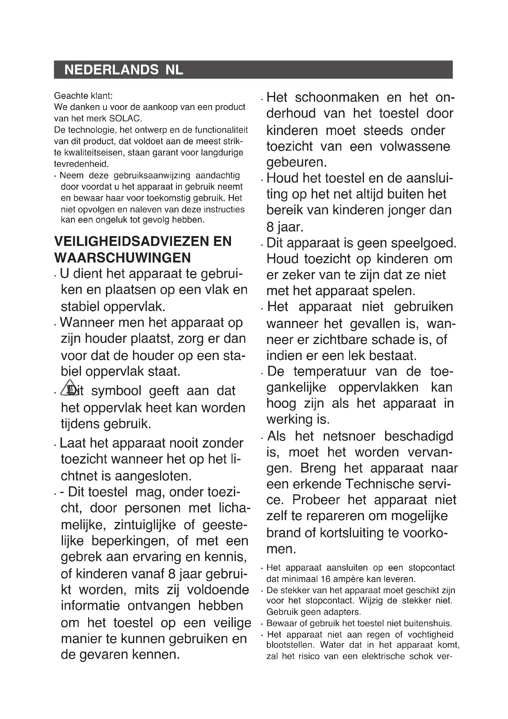 - Het product bevat geen materialen die schade- lijk zijn voor het milieu. - Dit symbool betekent dat u het product aan het eind van zijn levenscyclus moet afgeven aan een erkende afvalverwerker ten behoeve van de gescheiden verwerking van Afgedankte Elektrische en Elektronische Appa- ratuur (AEEA). Dit apparaat voldoet aan de laagspanningsricht- lijn 2014/35/EG, de richtlijn 2014/30/EG met be- trekking tot elektromagnetische compatibiliteit, de richtlijn 2011/65/EG met betrekking tot beper- kingen in de toepassing van bepaalde gevaarli- jke stoffen in elektrische en elektronische appa- raten en de richtlijn 2009/125/EG met betrekking tot de eisen inzake het ecologisch ontwerp van energie-gerelateerde producten.ČEŠKY CS Vážený zákazníku / Vážená zákaznice, Velmi vám děkujeme, že jste se rozhodl/a pro zakoupení výrobku značky SOLAC. Díky technologii, designu, typu provozu a sku- tečnosti, že produkt převyšuje nejpřísnější stan- dardy kvality, zaručuje plně uspokojivé používá- ní a dlouhou životnost.