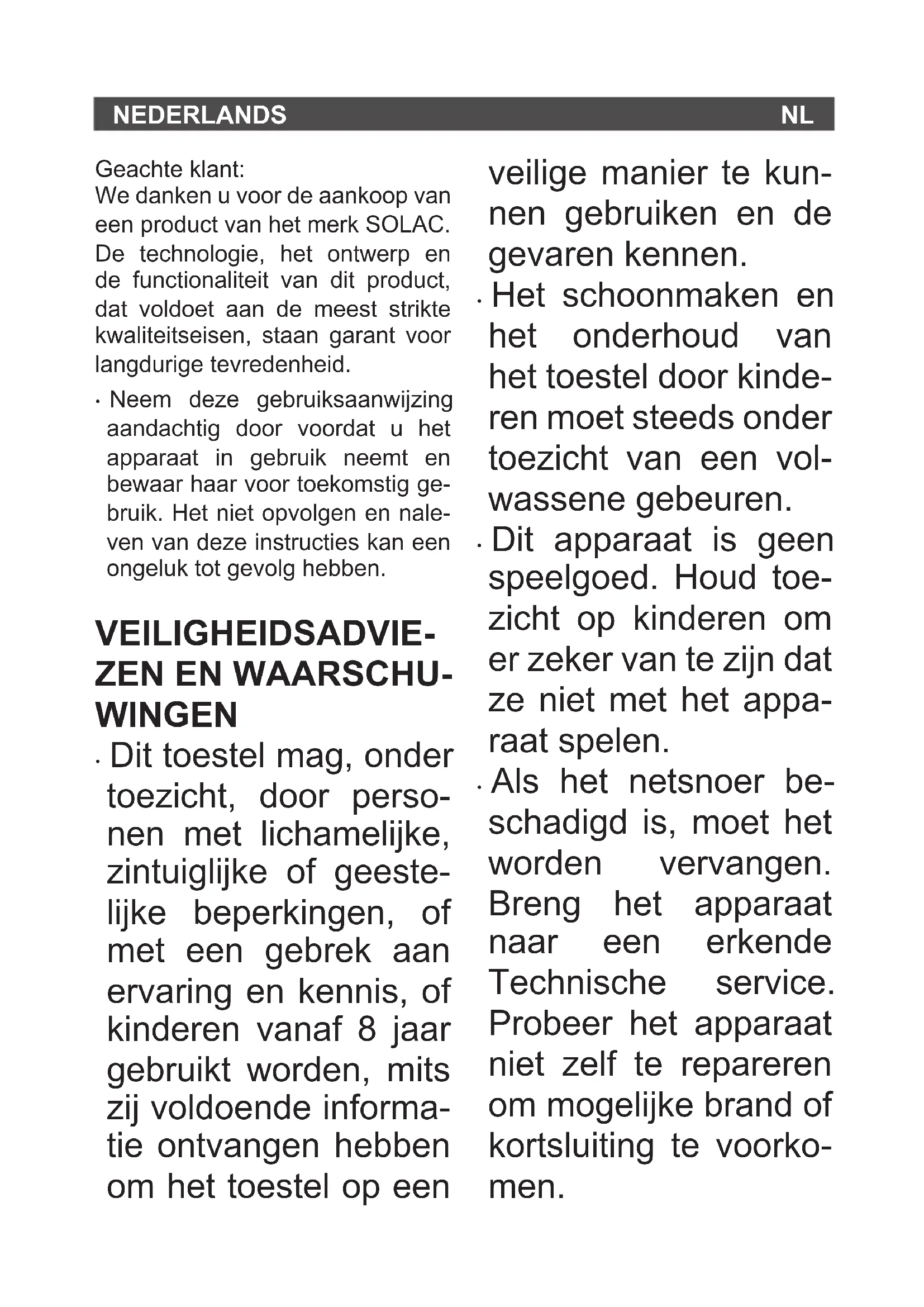 - I materiali che costituiscono l’im- ITNEDERLANDS NL Geachte klant: We danken u voor de aankoop van een product van het merk SOLAC. De technologie, het ontwerp en de functionaliteit van dit product, dat voldoet aan de meest strikte kwaliteitseisen, staan garant voor langdurige tevredenheid.