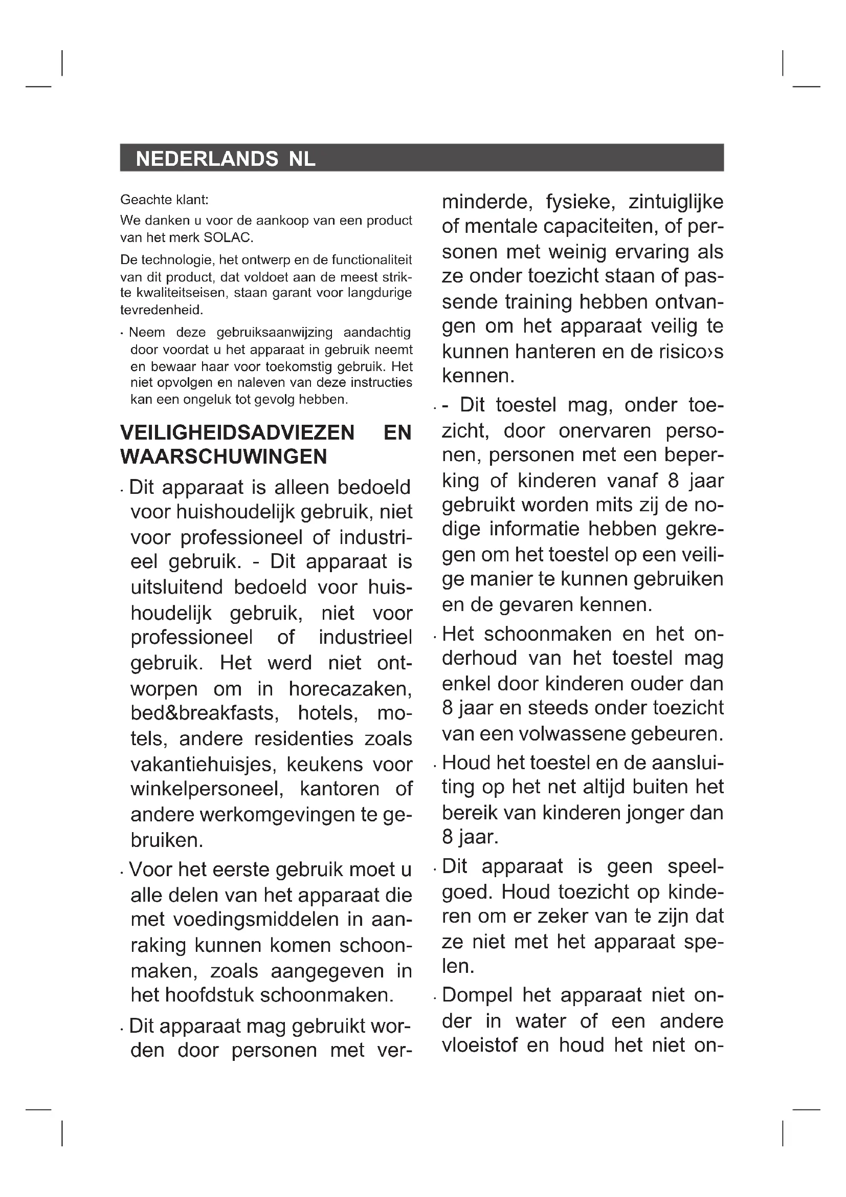 ONDERSTEUNING Dit product valt onder de legale garantie- voorwaarden zoals bepaald in de actuele wetge- ving. Om een beroep te doen op uw rechten of aanspraken kunt u contact opnemen met onze ofciële technische service. U kunt de dichtstbijzijnde technische service vin- den op de website: http://solac.com Voor verdere informatie kunt u ook contact met ons opnemen. U kunt deze gebruiksaanwijzing en eventuele actualiseringen ervan downloaden via http://so- lac.com