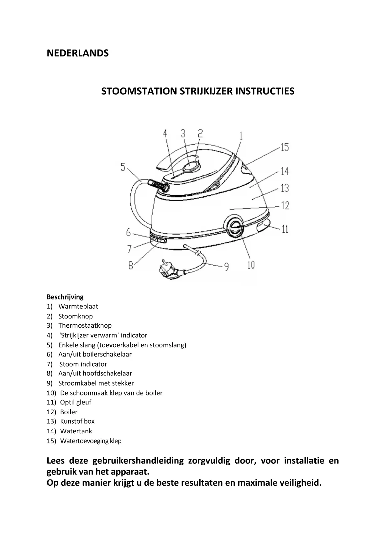 Lees deze gebruikershandleiding zorgvuldig door, voor installatie en gebruik van het apparaat. Op deze manier krijgt u de beste resultaten en maximale veiligheid.VEILIGHEIDSWAARSCHUWINGEN Lees de volgende instructies zorgvuldig door: - Voor gebruik eerst controleren of de spanningsbron overeenkomt met de spanning op het typeplaatje. Sluit het apparaat alleen aan op een juist geaard stopcontact (minimaal 10A). - Als de stekker niet overeenkomt met het stopcontact, laat dan een gekwalificeerde elektricien het stopcontact vervangen. - De elektrische veiligheid van dit apparaat wordt alleen gegarandeerd als het juist wordt geaard volgens de huidige veiligheidsregels. De fabrikant is niet aansprakelijk voor enige vorm van schade resulterend door een onjuiste aarding van het apparaat. Bij twijfel, raadpleeg een elektricien. - Laat geen water in het apparaat zitten als de kamertemperatuur onder 0℃ komt. - Na het uitpakken, controleer het apparaat op schade, en bij twijfel, niet het apparaat gebruiken en een elektricien raadplegen. - Verpakkingsmaterialen (plastic zakken, piepschuim, etc.) kunnen gevaarlijk zijn en moeten uit de buurt van kinderen worden gehouden. Het wordt niet aangeraden om adapters, verdelers en/of verlengkabels te gebruiken. Indien het noodzakelijk is, gebruik dan altijd adapters, verdelers en verlengkabels die voldoen aan de huidige veiligheidsregels. Overschrijdt niet het maximaal vermogen wat op de adapter staat aangegeven. - Dit apparaat is alleen voor huishoudelijk gebruik. Ander gebruik van het apparaat wordt ongeschikt geacht en is daardoor gevaarlijk. - De fabrikant is niet aansprakelijk voor enige vorm van schade resulterend door een onjuist, verkeerd of nalatiggebruik van het apparaat. - Dit apparaat is niet bedoeld voor gebruik door personen (waaronder kinderen) met een beperkt lichamelijk, fysisch of mentale beperking, of een gebrek aan ervaring en kennis, tenzij er toezicht is of instructies zijn voor het gebruik van het apparaat door een persoon verantwoordelijk voor hun veiligheid. - Bij het gebruik van een elektrisch apparaat, moet altijd de basisregels worden opgevolgd: - Als de stroomkabel beschadigd is, moet het worden vervangen door de fabrikant, een servicemonteur of een gelijkwaardig gekwalificeerd persoon om gevaren te vermijden. - Laat geen kinderen voor het strijkijzer staan als de 'Jet knop’ wordt ingedrukt, het bereik gaat ver. In het bijzonder: - Gebruik het apparaat niet met natte of vochtige handen of voeten. - Gebruik het apparaat niet in de badkamer. - Trek niet aan de stroomkabel om de stekker uit het stopcontact te halen. - Stel het apparaat niet bloot aan de elementen (regen, zon, vorst, etc.) . - Laat het apparaat niet gebruikt worden door kinderen of onverantwoorde personen tenzij er toezicht is. - Niet het apparaat onderdompelen onder water. - Laat het apparaat niet onbeheerd achter als het ingeschakeld is, dit is gevaarlijk. - Voor het schoonmaken of onderhouden van het apparaat of het vullen van de tank, altijd eerst het apparaat van de spanningsbron halen door de stekker te verwijderen. - Als het apparaat niet goed functioneert, schakel het dan uit en probeer het niet te repareren. Neem contact op met eenbevoegd reparatiepunt en zorg dat er originele onderdelen worden gebruikt. Het niet opvolgen van de bovenstaande punten kan gevolgen hebben voor de veiligheid van het apparaat. - Als u besluit het apparaat niet meer te gebruiken, verwijder de stekker uit het stopcontact en maak de stroomkabel los zodat het niet meer bruikbaar is. - De installatie moet worden uitgevoerd volgens de instructies van de fabrikant. - De stroomkabel mag niet vervangen worden door de gebruiker, omdat dit speciaal gereedschap vereist, als de stroomkabel beschadigd is, neem contact met op met een reparatiepunt. - Zorg dat de stroomkabel niet in contact komt met de strijkbout. - Als de veiligheidsonderbreking ingeschakeld is, zal het strijkijzer niet meer functioneren. Om dit te herstellen. Neem contact op met een elektricien. - Nooit de stoom richting personen spuiten, dit is uitermate gevaarlijk. - Gebruik het strijkijzer niet op hele natte stoffen. - Gebruik het strijkijzer niet op de persoon als de plaat heet is. - Doe de watertank niet te vol en voeg geen vlekkenverwijderaar of dergelijke producten toe in de watertank of boiler. - Haal de stekker uit het stopcontact als het apparaat niet gebruikt wordt. Laat het apparaat niet onnodig aanstaan. - Nooit de schoonmaakklep openmaken als het apparaat nog aangesloten zit aan het stroomnet. - Het apparaat moet worden geplaatst op een vlakke ondergrond die tegen hoge temperaturen kan. - EEC Richtlijn 87/308(D.M. 13/04/89)。Bewaar dit boekje op een veilige plek voor toekomstig gebruik. Dit apparaatvoldoet aan EEC Richtlijn 87/308(D.M. 13/04/89) wat betreft verstoring van de radio