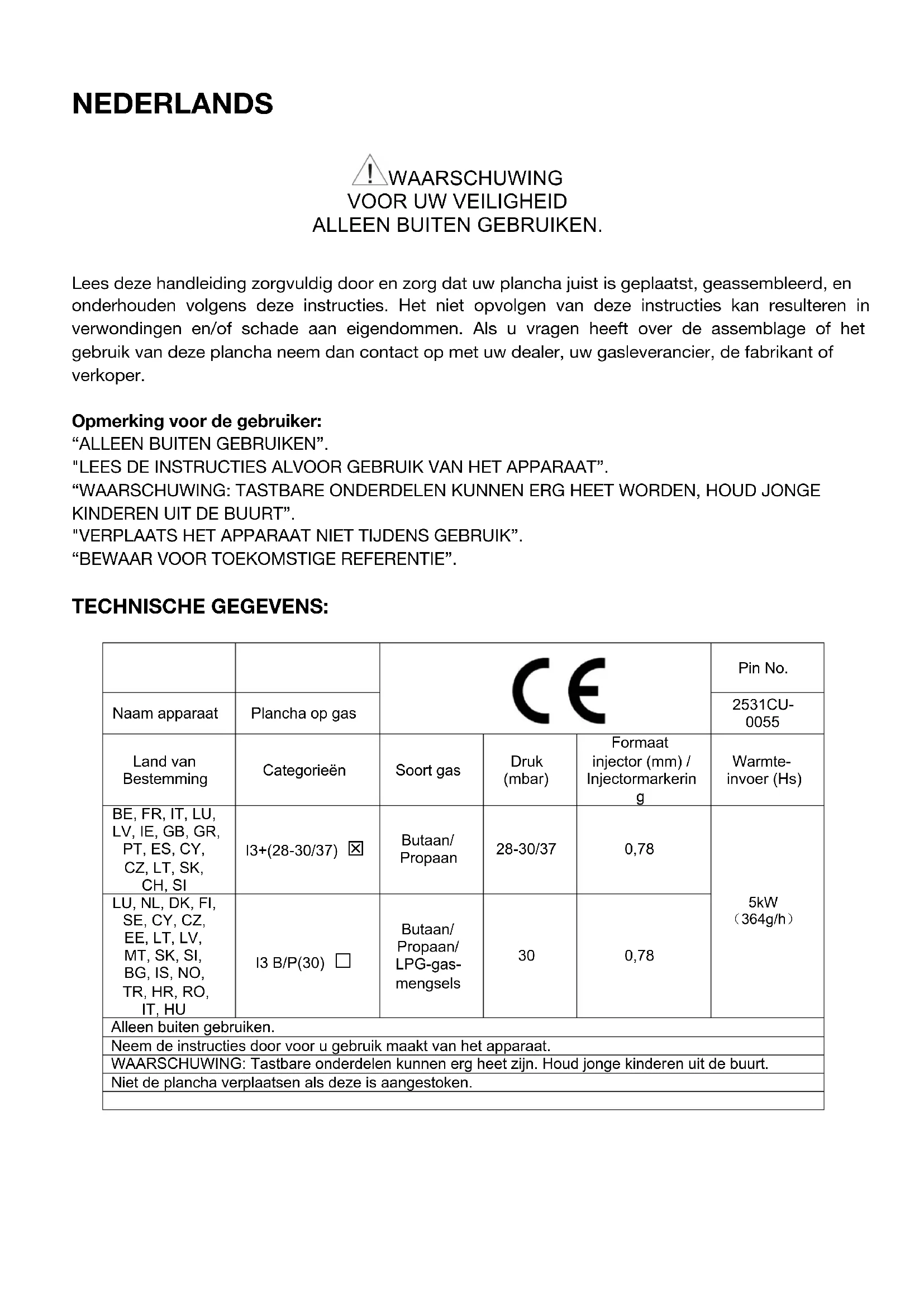 Lees deze handleiding zorgvuldig door en zorg dat uw plancha juist is geplaatst, geassembleerd, en onderhouden volgens deze instructies. Het niet opvolgen van deze instructies kan resulteren in verwondingen en/of schade aan eigendommen. Als u vragen heeft over de assemblage of het gebruik van deze plancha neem dan contact op met uw dealer, uw gasleverancier, de fabrikant of verkoper. Opmerking voor de gebruiker: “ALLEEN BUITEN GEBRUIKEN”. "LEES DE INSTRUCTIES ALVOOR GEBRUIK VAN HET APPARAAT”. “WAARSCHUWING: TASTBARE ONDERDELEN KUNNEN ERG HEET WORDEN, HOUD JONGE KINDEREN UIT DE BUURT”. "VERPLAATS HET APPARAAT NIET TIJDENS GEBRUIK”. “BEWAAR VOOR TOEKOMSTIGE REFERENTIE”. TECHNISCHE GEGEVENS: