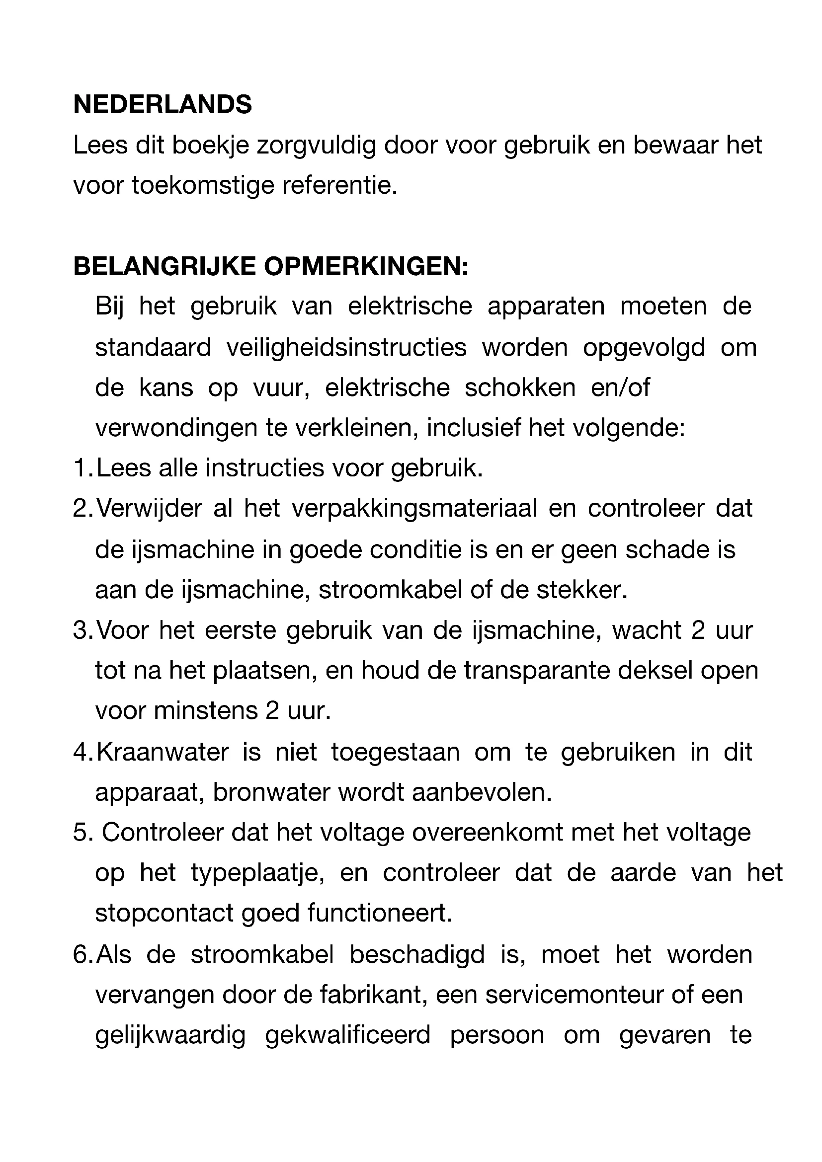 - Voor het eerste gezruik van de ijsmachine, wacht 2aar tot na hetplaatsen, en houd de transparante deksel open voor minstens 2aar.