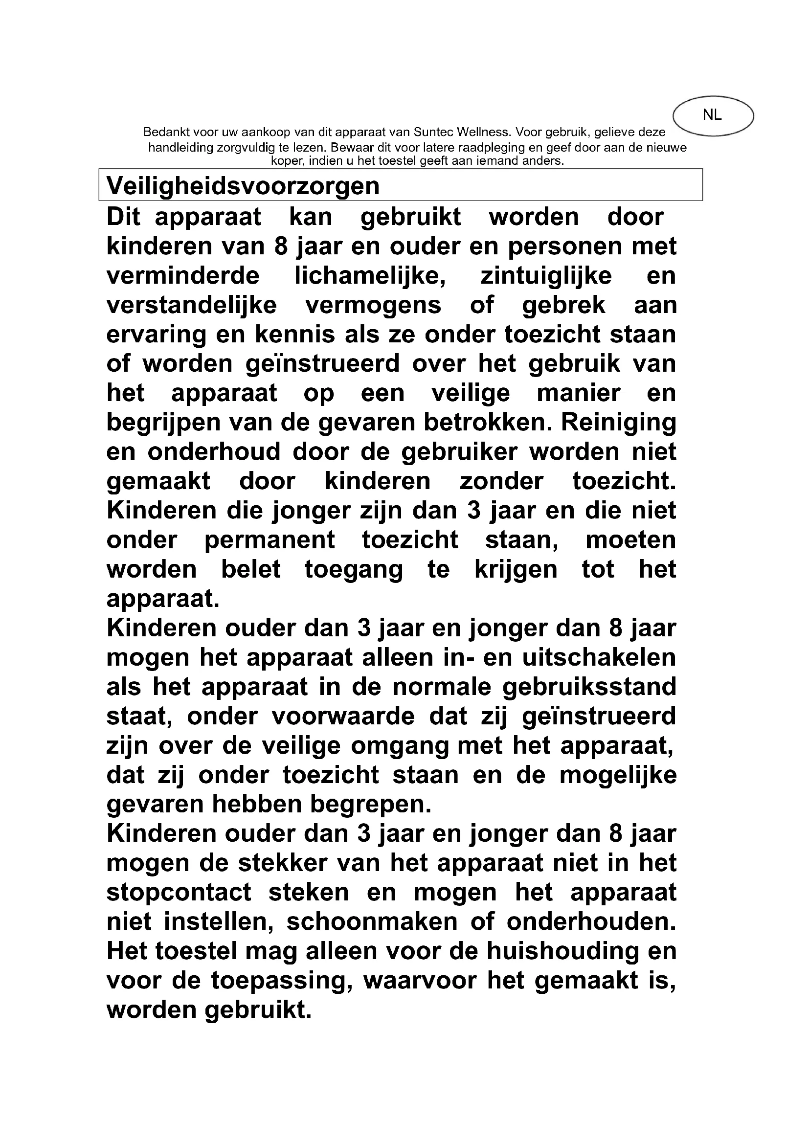 DryFix SUNTEC WELLNESS GMBH / HOLZSTRASSE 2 / 40 221 DÜSSELDORF / GERMANYBedankt voor uw aankoop van dit apparaat van Suntec Wellness. Voor gebruik, gelieve deze handleiding zorgvuldig te lezen. Bewaar dit voor latere raadpleging en geef door aan de nieuwe koper, indien u het toestel geeft aan iemand anders. Veiligheidsvoorzorgen Dit apparaat kan gebruikt worden door kinderen van 8 jaar en ouder en personen met verminderde lichamelijke, zintuiglijke en verstandelijke vermogens of gebrek aan ervaring en kennis als ze onder toezicht staan of worden geïnstrueerd over het gebruik van het apparaat op een veilige manier en begrijpen van de gevaren betrokken. Reiniging en onderhoud door de gebruiker worden niet gemaakt door kinderen zonder toezicht. Kinderen die jonger zijn dan 3 jaar en die niet onder permanent toezicht staan, moeten worden belet toegang te krijgen tot het apparaat. Kinderen ouder dan 3 jaar en jonger dan 8 jaar mogen het apparaat alleen in- en uitschakelen als het apparaat in de normale gebruiksstand staat, onder voorwaarde dat zij geïnstrueerd zijn over de veilige omgang met het apparaat, dat zij onder toezicht staan en de mogelijke gevaren hebben begrepen. Kinderen ouder dan 3 jaar en jonger dan 8 jaar mogen de stekker van het apparaat niet in het stopcontact steken en mogen het apparaat niet instellen, schoonmaken of onderhouden. Het toestel mag alleen voor de huishouding en voor de toepassing, waarvoor het gemaakt is, worden gebruikt. NL1. Lees de handleiding voordat u de luchtontvochtiger gebruikt zorgvuldig door en bewaar deze op een veilige plaats.