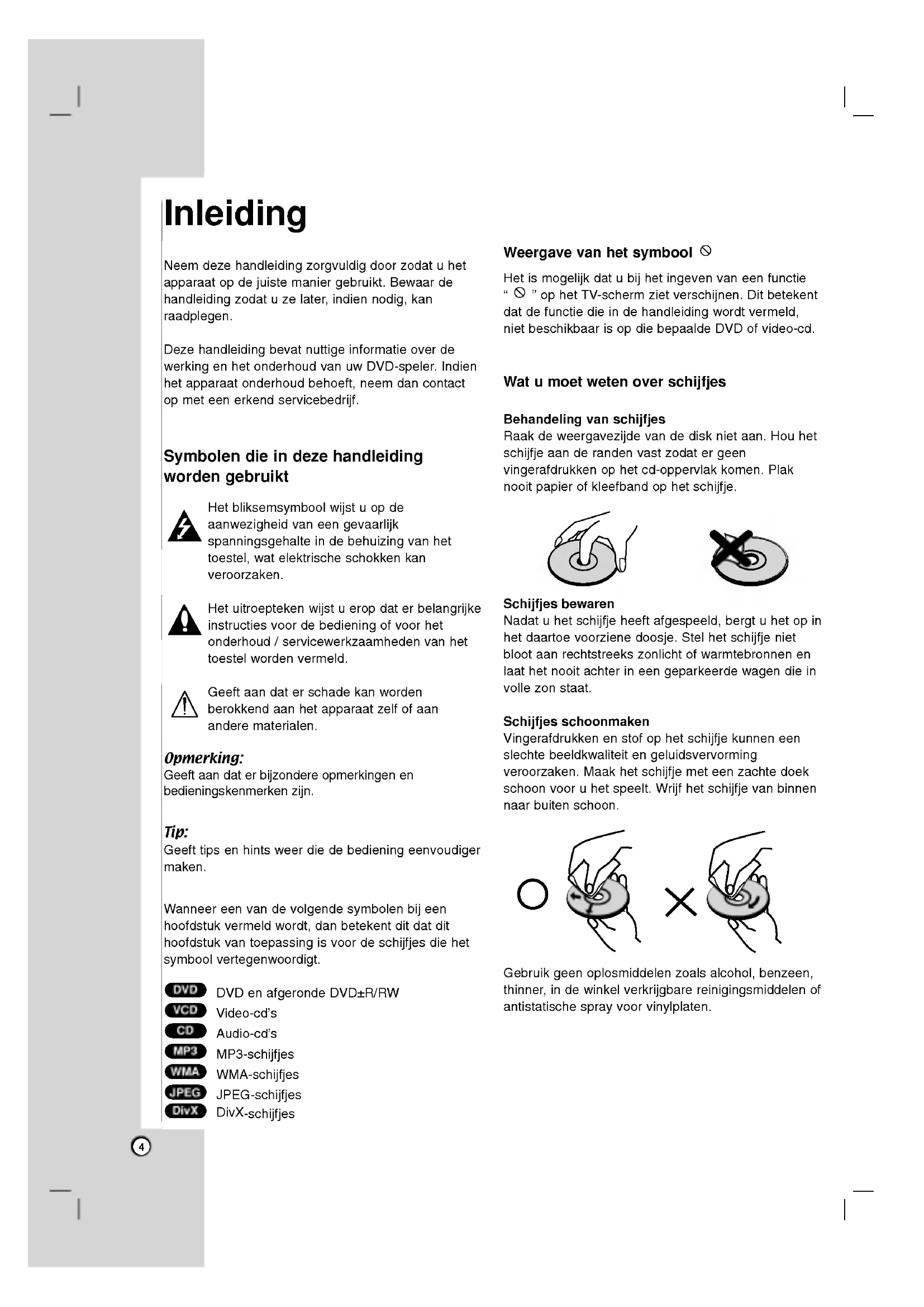 - Technischespecificaties Neemdezehandleidingzorgvuldigdoorzodatuhetapparaatopdejuistemaniergebruikt.Bewaardehandleidingzodatuzelater,indiennodig,kanraadplegen.DezehandleidingbevatnuttigeinformatieoverdewerkingenhetonderhoudvanuwDVD-speler.Indienhetapparaatonderhoudbehoeft,neemdancontactopmeteenerkendservicebedrijf. Symbolen dieindeze handleiding worden gebruikt Hetbliksemsymboolwijstuopdeaanwezigheidvaneengevaarlijkspanningsgehalteindebehuizingvanhettoestel,watelektrischeschokkenkanveroorzaken.Hetuitroeptekenwijstueropdaterbelangrijkeinstructiesvoordebedieningofvoorhetonderhoud/servicewerkzaamhedenvanhettoestelwordenvermeld.Geeftaandaterschadekanwordenberokkendaanhetapparaatzelfofaananderematerialen. Opmerking: Geeftaandaterbijzondereopmerkingenenbedieningskenmerkenzijn. Tip: Geefttipsenhintsweerdiedebedieningeenvoudigermaken.Wanneereenvandevolgendesymbolenbijeenhoofdstukvermeldwordt,danbetekentditdatdithoofdstukvantoepassingisvoordeschijfjesdiehetsymboolvertegenwoordigt.DVDenafgerondeDVD±R/RWVideo-cd'sAudio-cd'sMP3-schijfjesWMA-schijfjesJPEG-schijfjes DivX-schijfjes Weergave van het symbool Hetismogelijkdatubijhetingevenvaneenfunctie p. 264