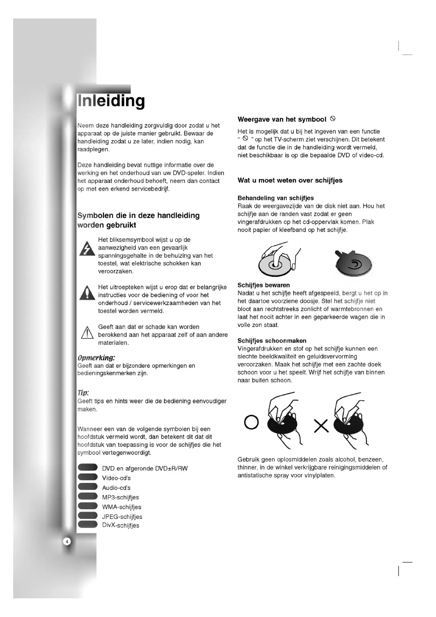 - Technischespecificaties Neemdeze handleiding zorgvuldig doorzodatuhetapparaatopde juiste manier gebruikt. Bewaarde handleiding zodatuzelater,indien nodig, kan raadplegen. Deze handleiding bevat nuttige informatieoverde werking enhetonderhoudvanuw DVD-speler. Indienhetapparaatonderhoudbehoeft,neemdancontactopmeteenerkend servicebedrijf. Symbolen die deze handleiding worden gebruikt Het bliksemsymbool wijst uopde aanwezigheid vaneen gevaarlijk spanningsgehalte inde behuizing vanhettoestel,watelektrischeschokkenkanveroorzaken.Het uitroepteken wijst ueropdater belangrijke instructiesvoorde bediening ofvoorhetonderhoud/servicewerkzaamhedenvanhettoestelwordenvermeld.Geeftaandaterschadekanwordenberokkendaanhetapparaatzelfofaananderematerialen. Opmerking: Geeftaandater bijzondere opmerkingen bedieningskenmerken zijn. Tip: Geeft tips enhintsweerdiede bediening eenvoudiger maken.Wanneereenvande volgende symbolen bij eenhoofdstukvermeldwordt,danbetekentditdatdithoofdstukvan toepassing isvoorde schijfjes diehet symbool vertegenwoordigt. DVDen afgeronde DVD±R/RWVideo-cd'sAudio-cd's MP3-schijfjes WMA-schijfjes JPEG-schijfjes DivX-schijfjes Weergave van het symbool Hetis mogelijk datu bij het ingeven vaneenfunctie p. 264