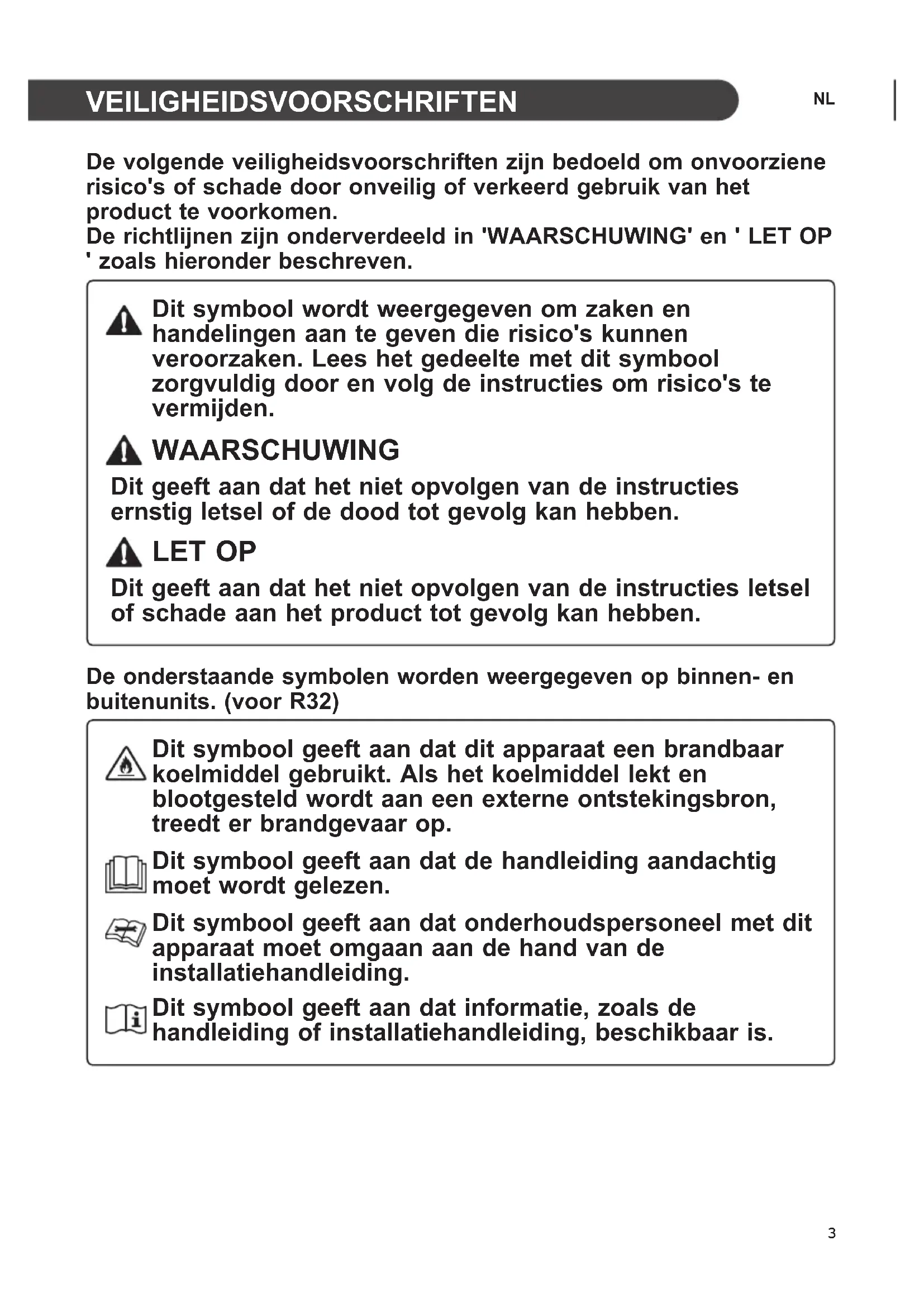 De volgende veiligheidsvoorschriften zijn bedoeld om onvoorziene risico's of schade door onveilig of verkeerd gebruik van het product te voorkomen. De richtlijnen zijn onderverdeeld in 'WAARSCHUWING' en ' LET OP ' zoals hieronder beschreven. Dit symbool wordt weergegeven om zaken en handelingen aan te geven die risico's kunnen veroorzaken. Lees het gedeelte met dit symbool zorgvuldig door en volg de instructies om risico's te vermijden. WAARSCHUWING Dit geeft aan dat het niet opvolgen van de instructies ernstig letsel of de dood tot gevolg kan hebben. LET OP Dit geeft aan dat het niet opvolgen van de instructies letsel of schade aan het product tot gevolg kan hebben. De onderstaande symbolen worden weergegeven op binnen- en buitenunits. (voor R32) Dit symbool geeft aan dat dit apparaat een brandbaar koelmiddel gebruikt. Als het koelmiddel lekt en blootgesteld wordt aan een externe ontstekingsbron, treedt er brandgevaar op. Dit symbool geeft aan dat de handleiding aandachtig moet wordt gelezen. Dit symbool geeft aan dat onderhoudspersoneel met dit apparaat moet omgaan aan de hand van de installatiehandleiding. Dit symbool geeft aan dat informatie, zoals de handleiding of installatiehandleiding, beschikbaar is.4
